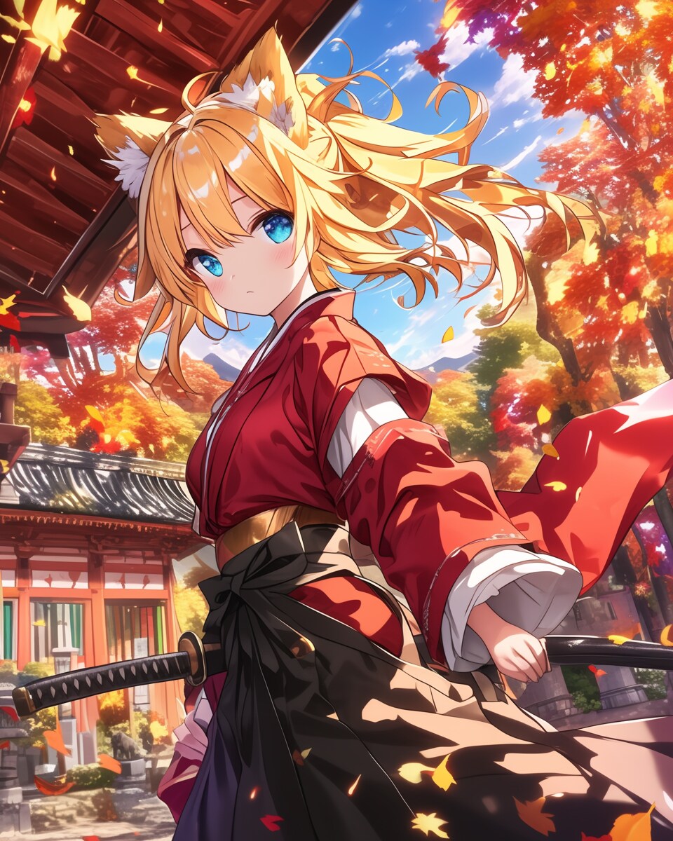 秋の神社でひっそりと剣を携える、狐耳の少女「紅葉(もみじ)」。