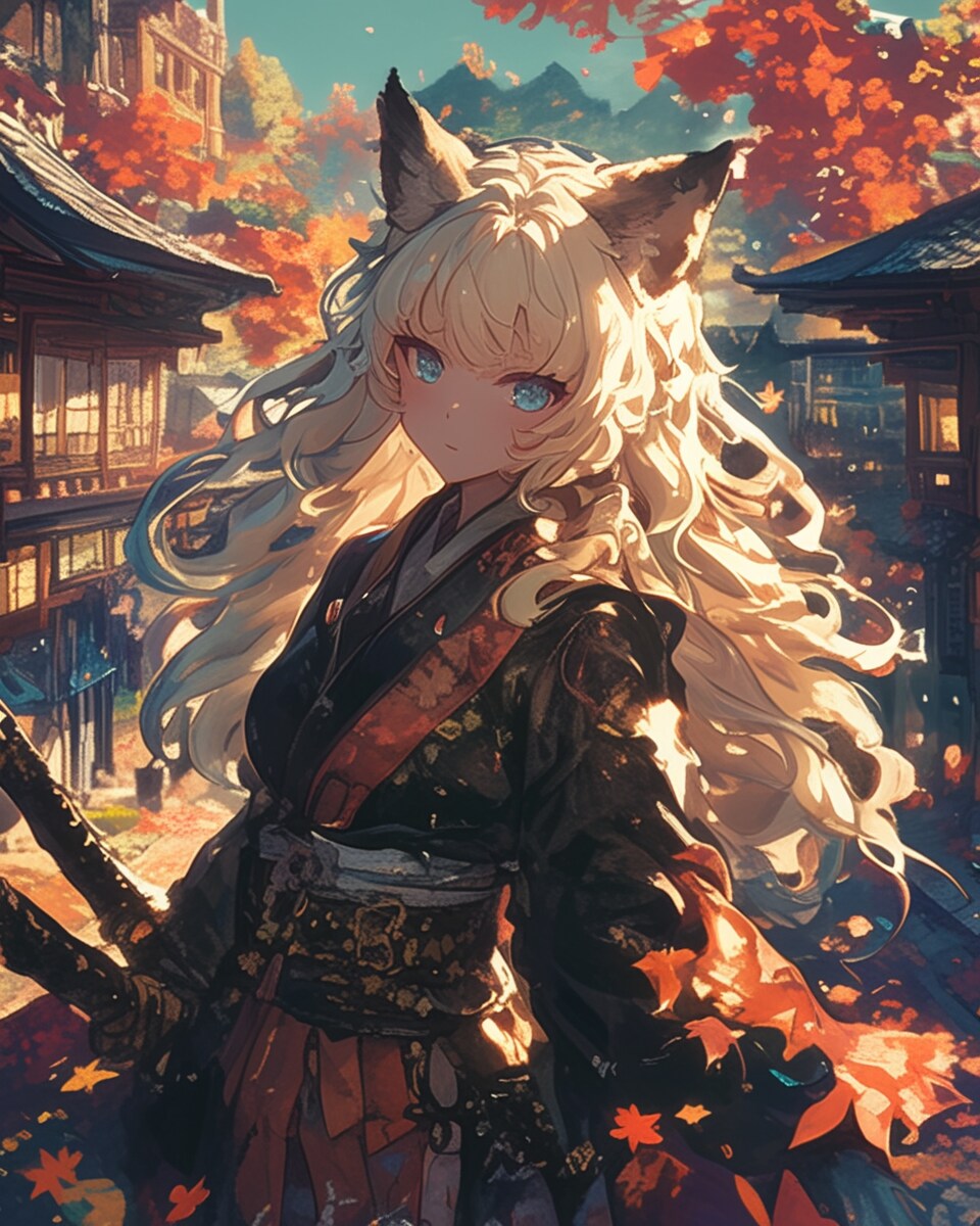 彼女は、代々神社を守る一族の末裔であり、その血には古代の霊力が流れている。彼女が剣を抜けば、風がざわめき、木々が応えるように色づくという伝説がある。この神社を訪れた人々は彼女の姿を一瞬だけ見かけ、その後はまるで幻を見たかのように記憶が薄れていく。実は、紅葉は人々を守る影の守護者であり、秋の季節だけ現れては神社と里を静かに見守っている。