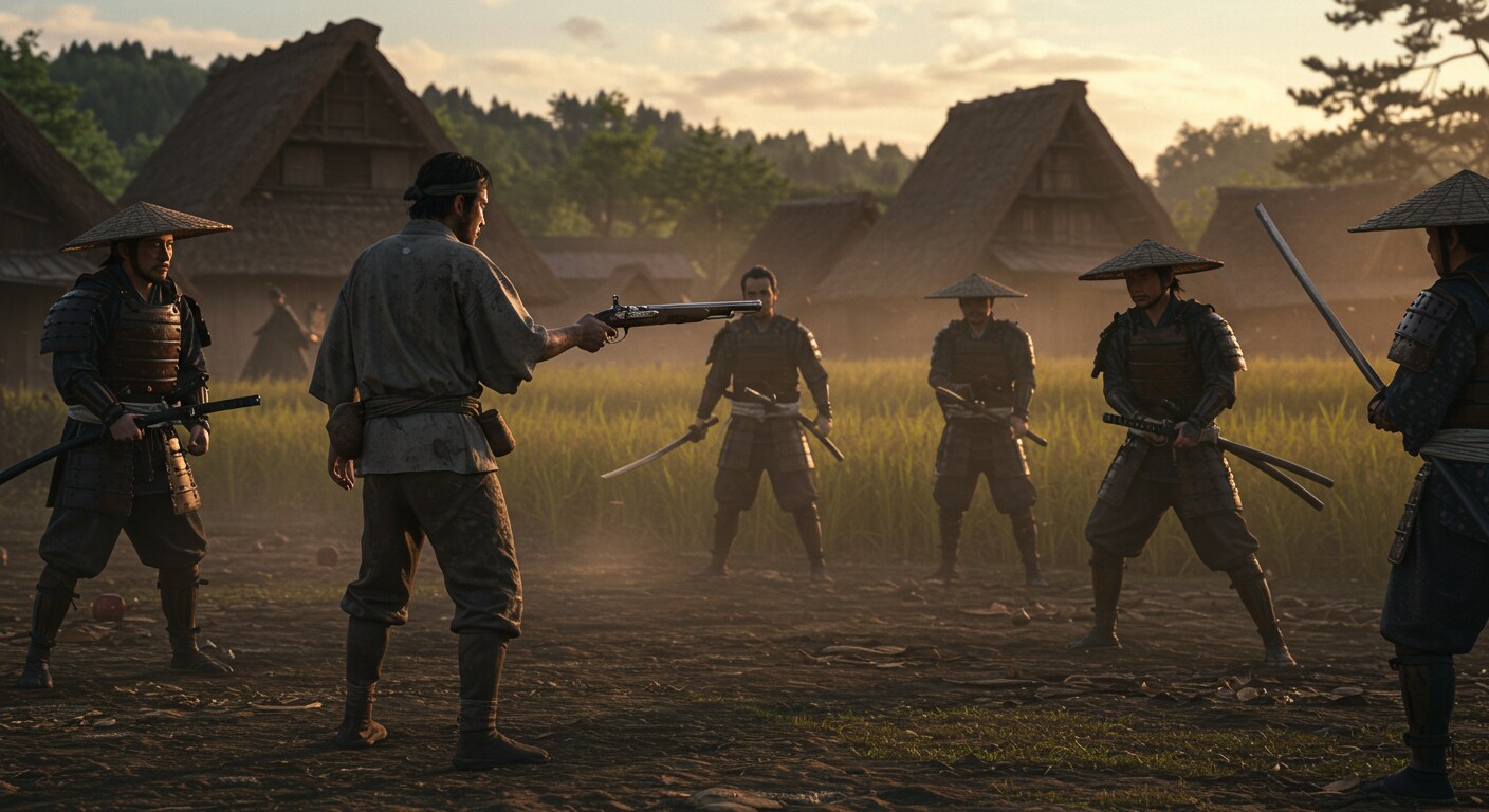レジスタンス組織を壊滅しようと村を襲撃してきたキツツキ軍の侍たちと対峙する、レジスタンス組織のリーダー