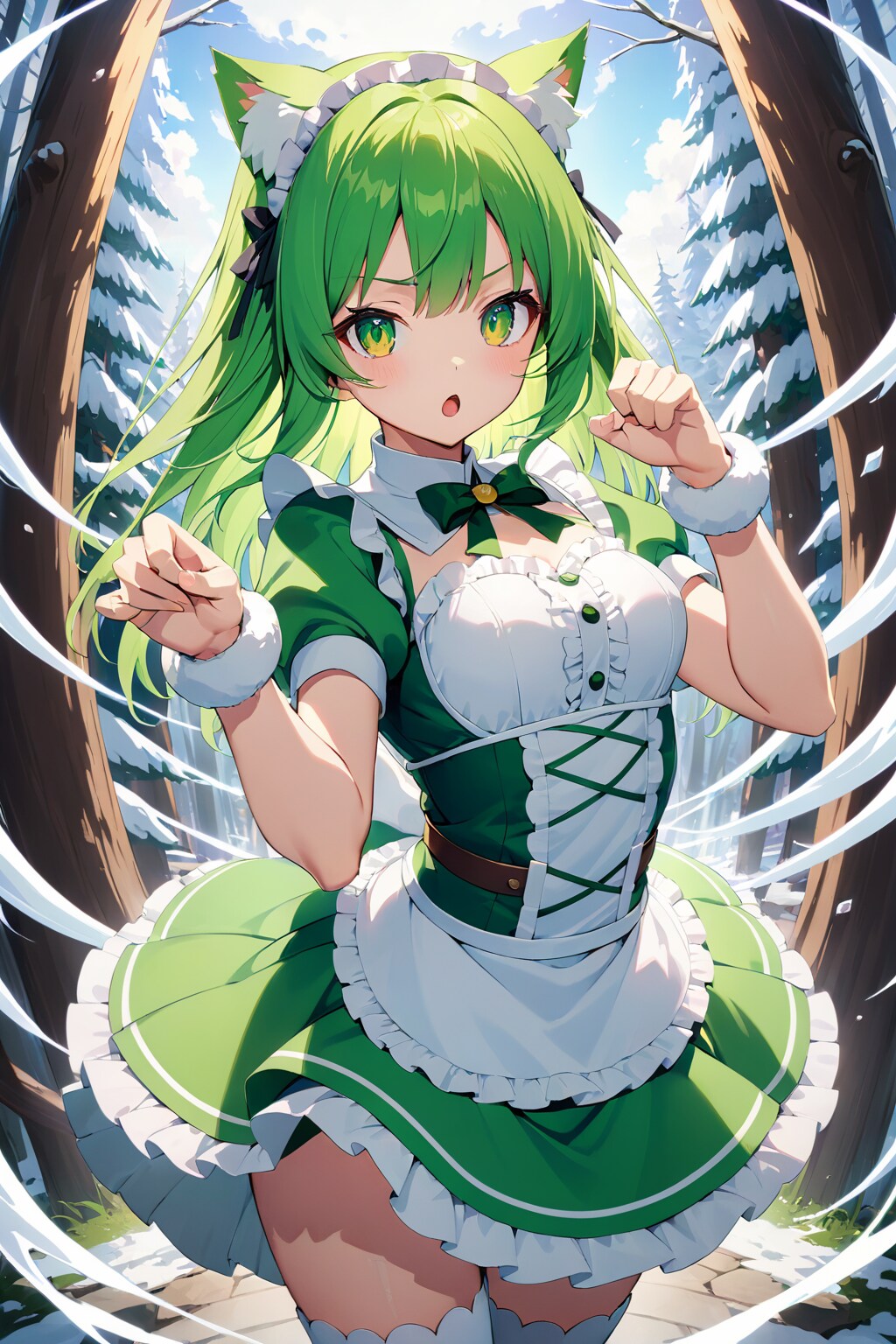 ミラ様の引用生成してくれたねこめいどを見て。strike poseで引っ掻きポーズが決まれば猫耳のほうがいいかもしれないと、インスパイアされ引用して生成してみました。手は完全にガチャなので引っ掻く感じになかなかなりませんね。狙ってない時は結構出るのですが。