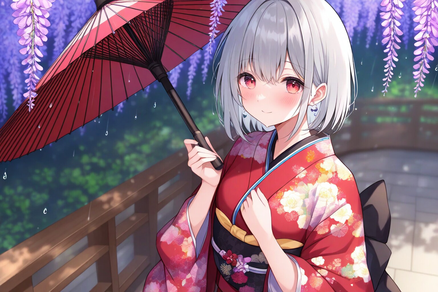 少女の赤い着物には、まだ少しだけ雨粒が残っている。