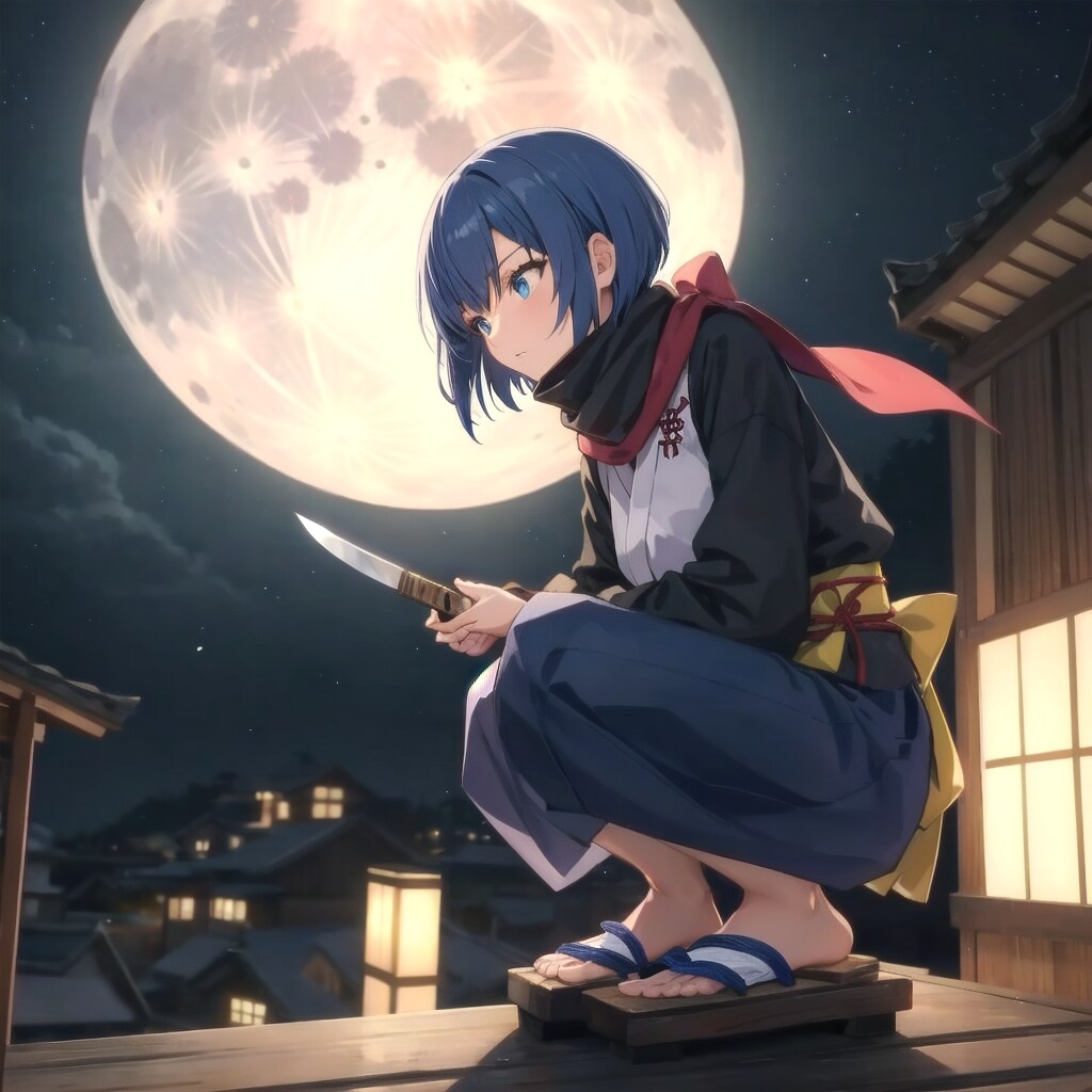 青髪ボブ子ちゃんが、黒い忍者装束と風になびく紺色のスカーフをまとい、「木製のクナイ」と短刀を持って屋根の上に構えている。夜の空に月が輝き、彼女のシルエットを浮かび上がらせている。映画のような躍動感あるショット。