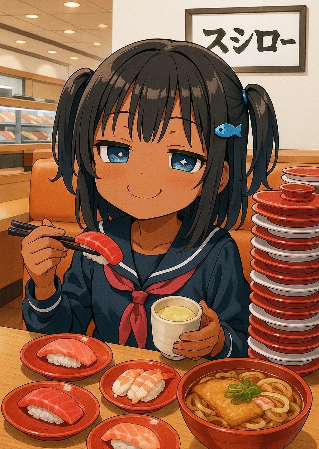 回転寿司でお腹いっぱい食べるこなつちゃん