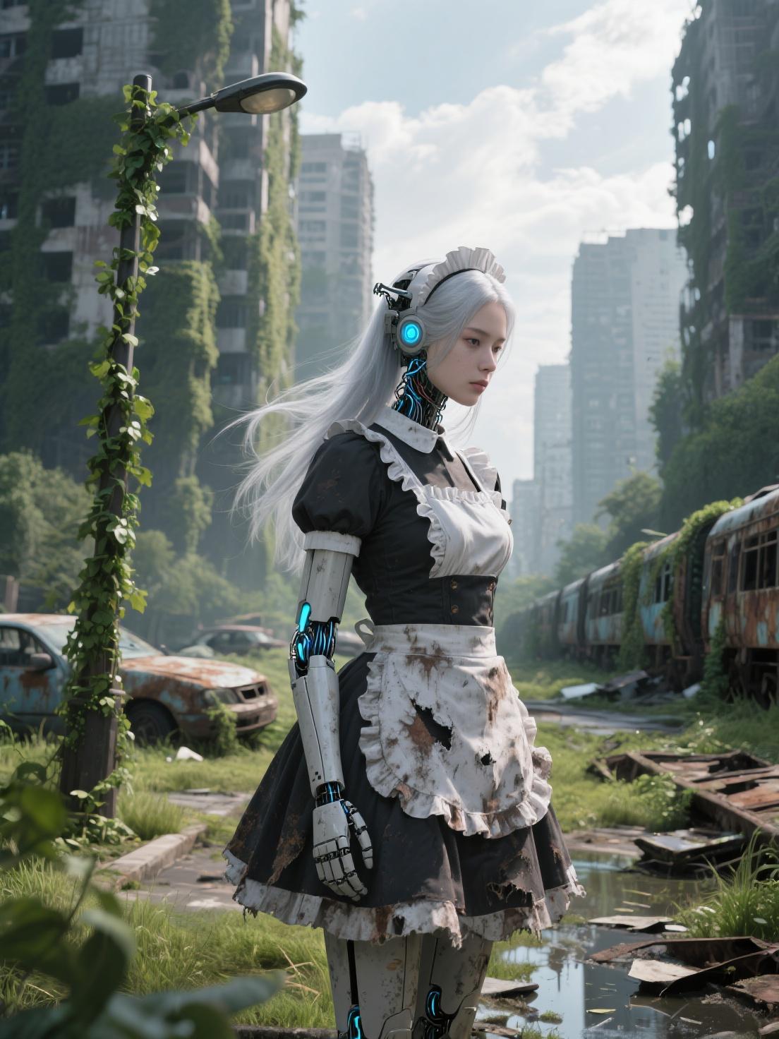 そのひとつが、メイド型家事支援アンドロイド《RINA-12》。彼女は今はもう存在しない旦那様の家を、誰の命令でもなく守り続けている。朝、埃を払って窓を磨き、崩れかけた戸棚に丁寧に食器を並べる。台所では空になった缶を並べ、まるで本当に料理をしているかのように動作を繰り返す。