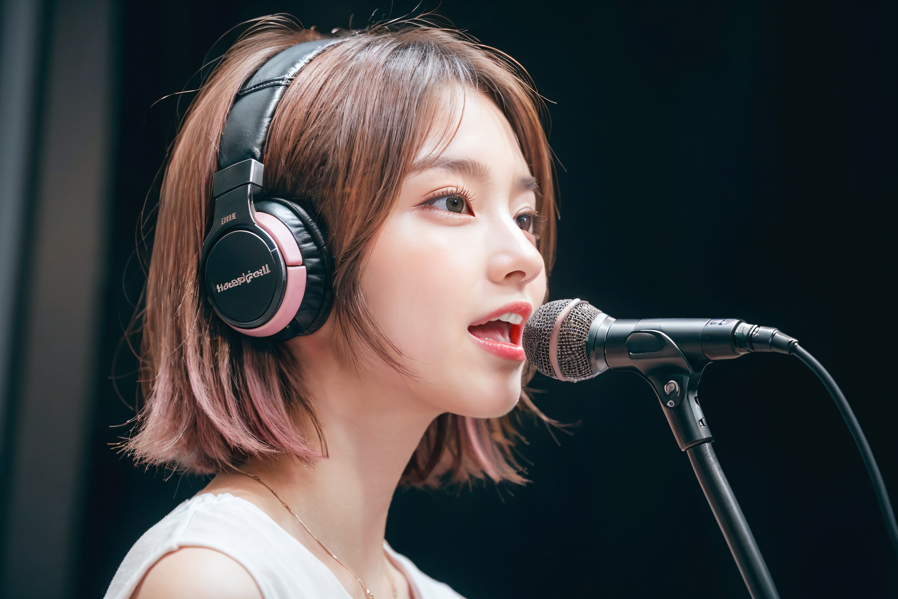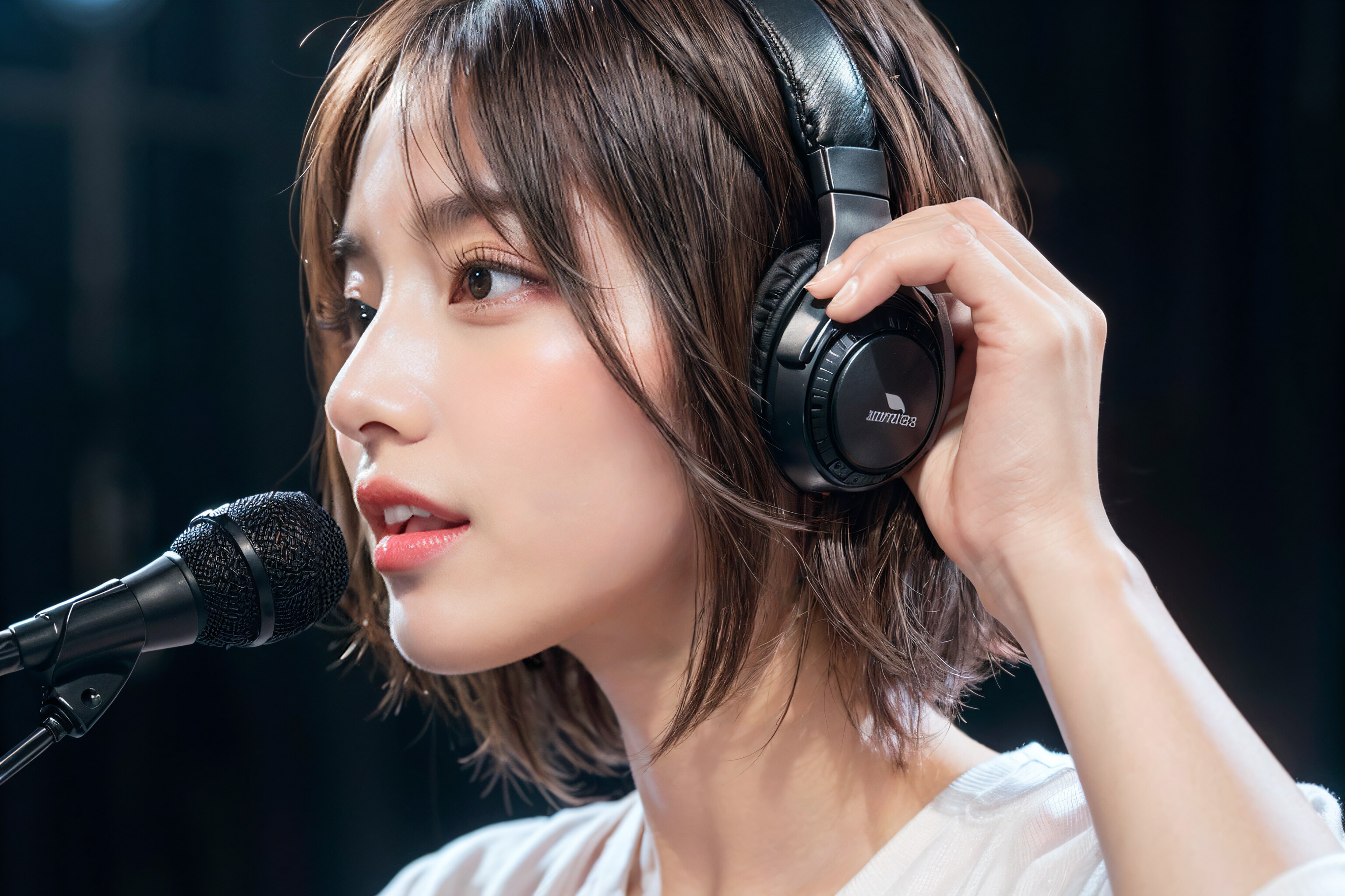 「今、マイクの前に立って、歌を歌う瞬間。音楽に集中して、ヘッドフォンから流れる自分の声を確認している。少し緊張しているけれど、自分の歌が誰かの心に届くことを願っている。歌うことが大好きだから、この瞬間が本当に幸せ。」