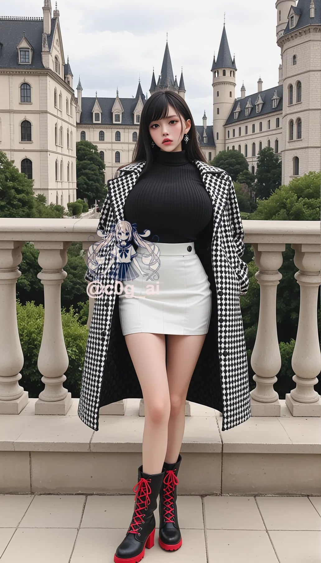 3枚目は、格子柄のコート、黒セーター、白ミニスカート、ブーツ