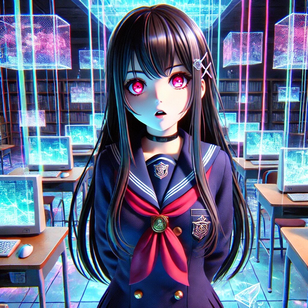 ししょちゃんが、デジタル教室内で突然フリーズしたホログラムに囲まれ、驚いた表情を浮かべている。生徒会バッジを胸につけ、仮想空間での異常を探る姿。