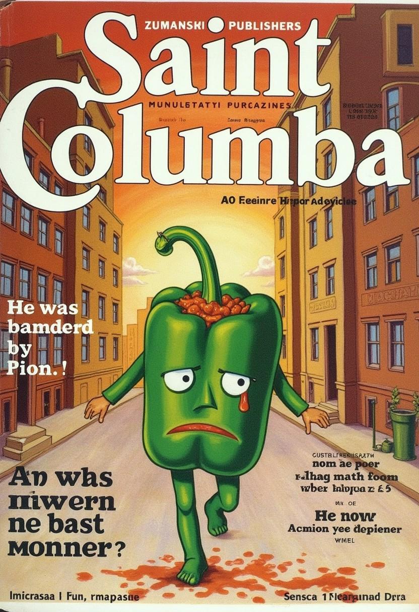 ピーマン男は悲しげな表情で体中からケチャップを噴射しながら、ソ連風の共同住宅が建ち並んだ通りを歩いていいます。