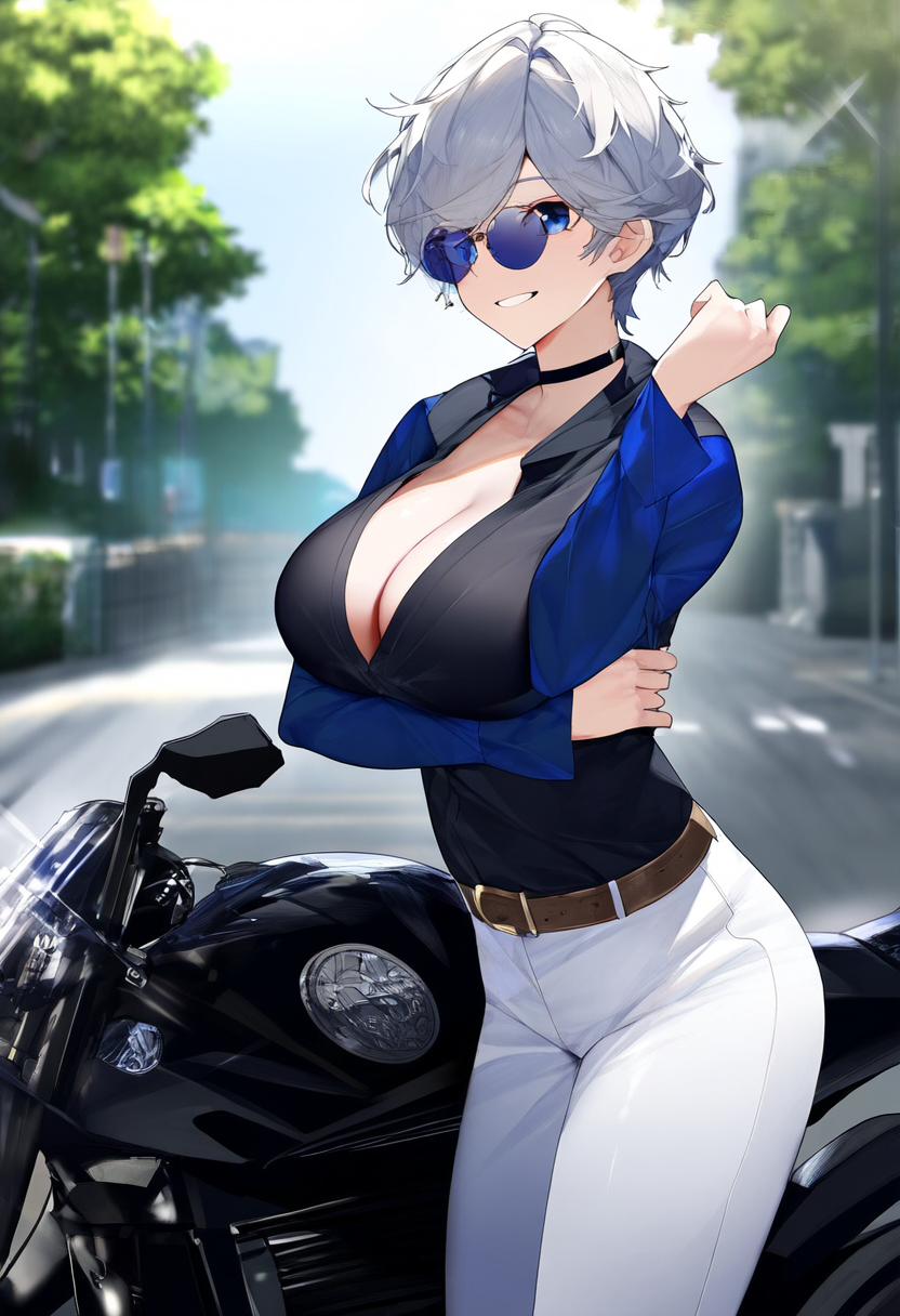 ボーイッシュ女子のテストで生成した名残。からだの造形やバイクの機構などおかしなところアリ。
