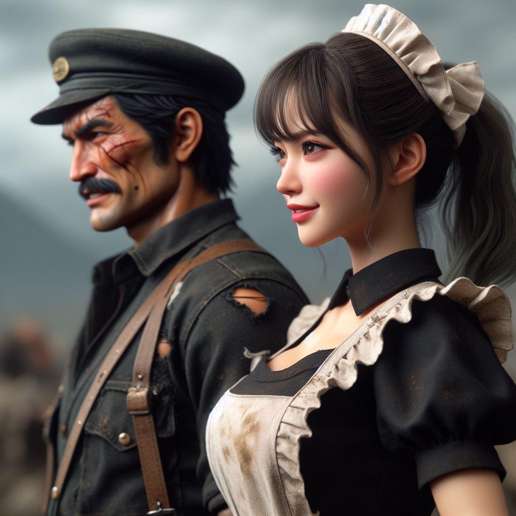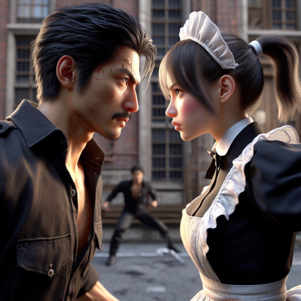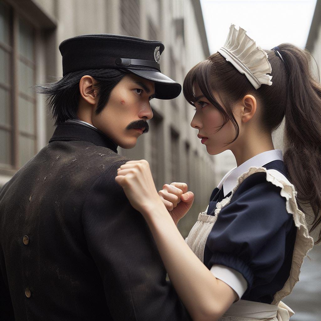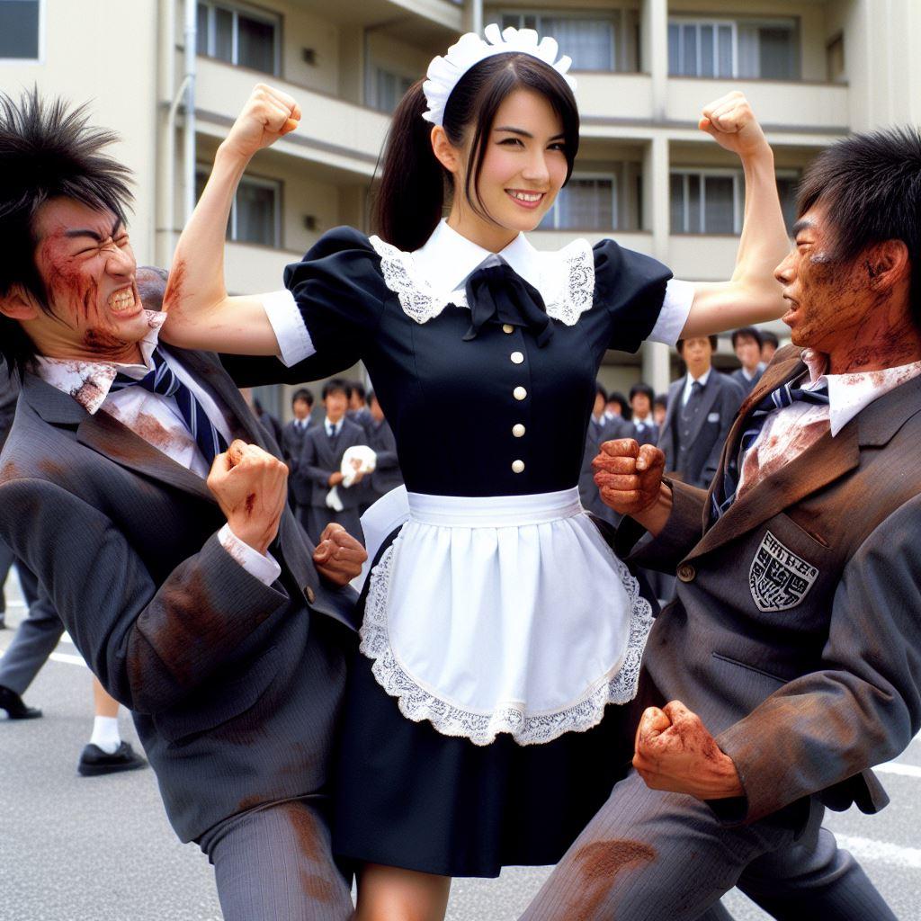 Dalleも暴力・グロ系は受けつけないものの、アクション系は意外と好きなようで、元気一杯のメイドとボロボロの不良生徒たちの画像を量産してくれるから、捗りましたw
