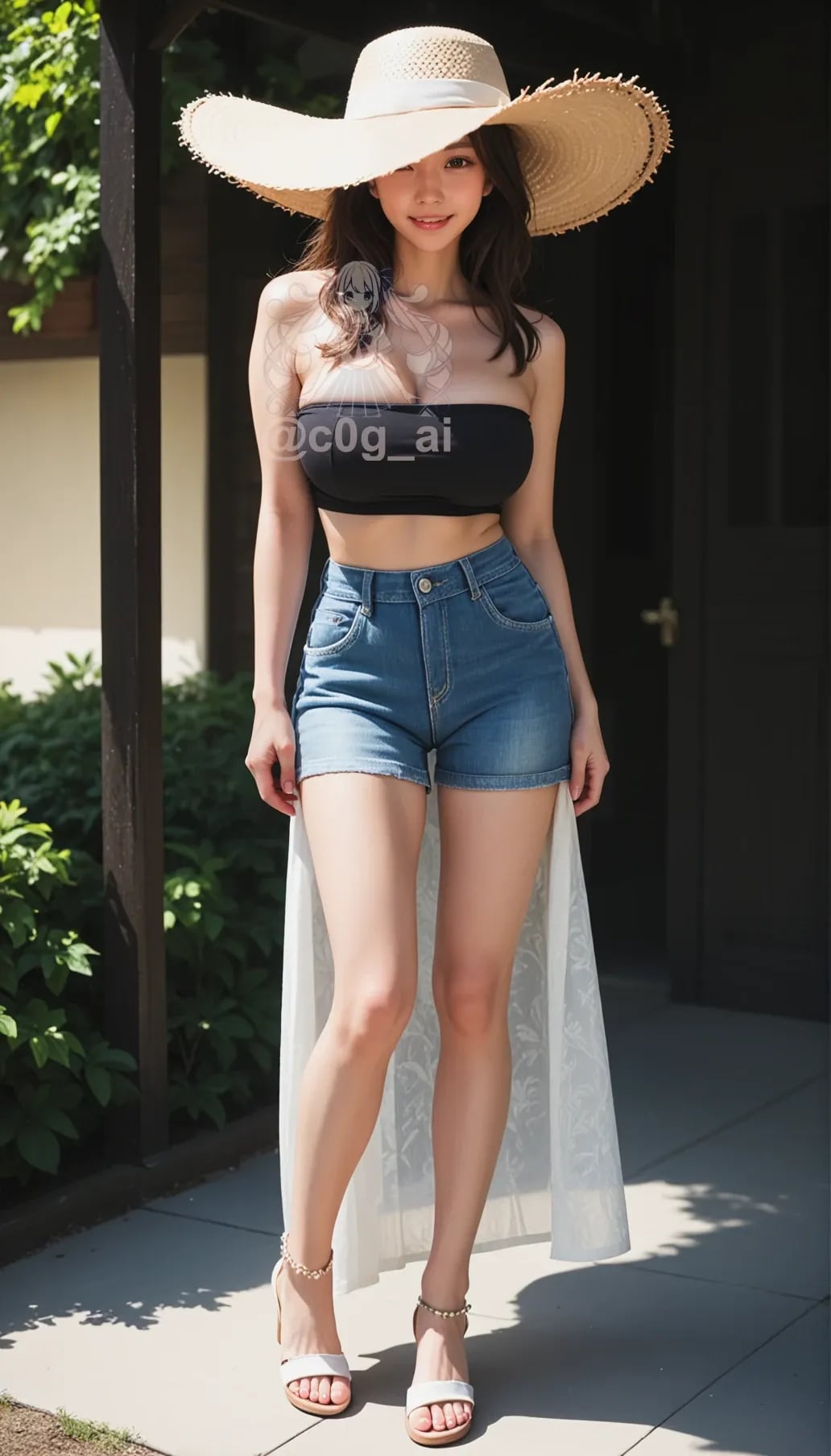 本来のコーデは、白いドレスのを羽織って、中にバンドゥビキニトップ、下はデニムショーパン、麦わら帽子、サングラスなのですが、ドレスの部分が出なくて、出ても1枚目のような腰巻き?になってしまいました。