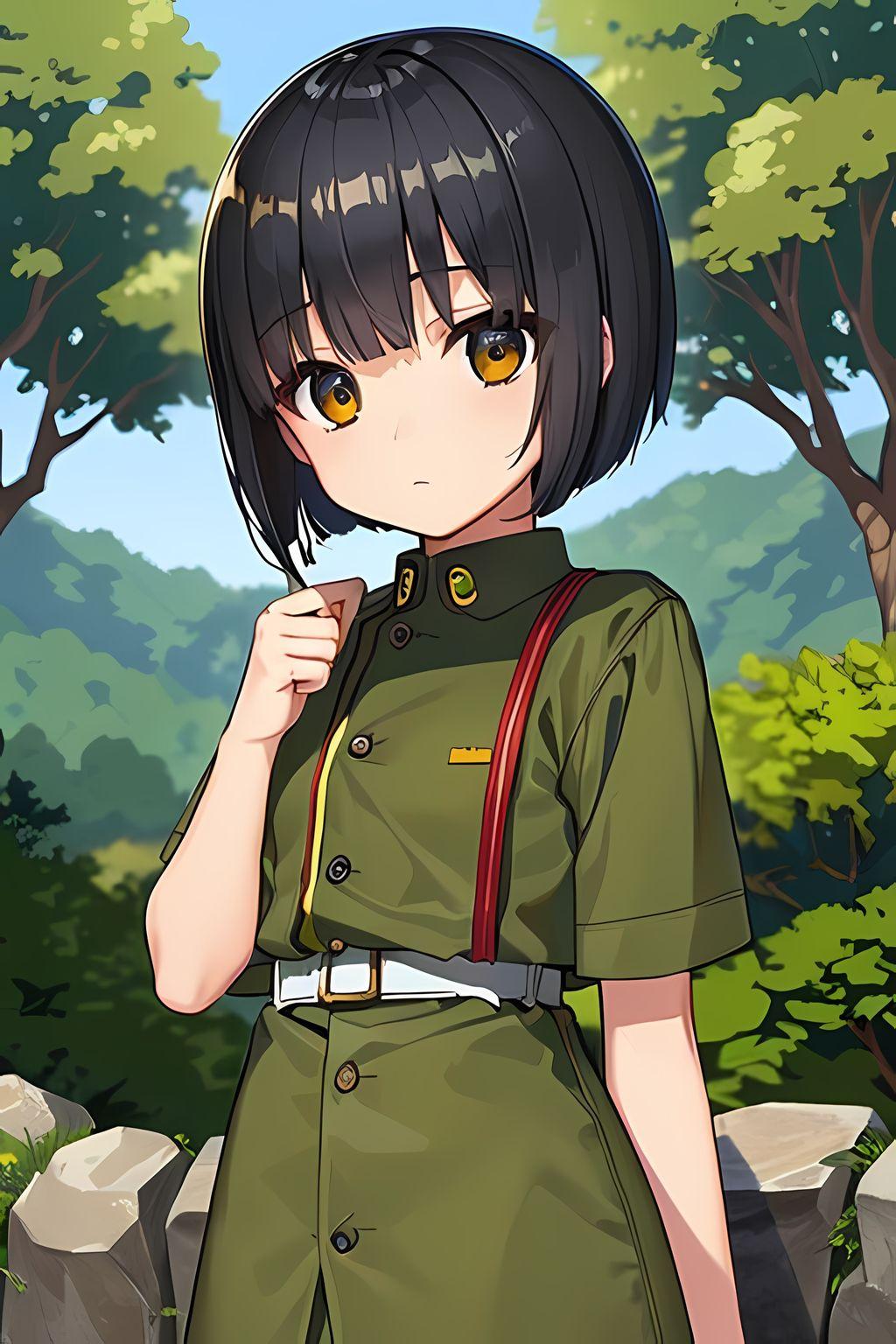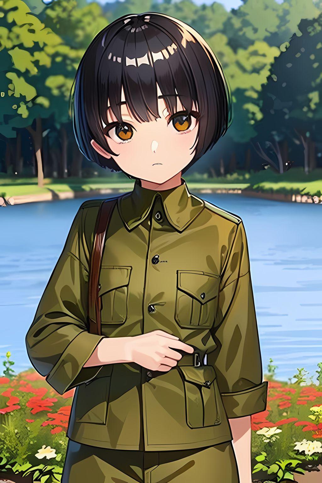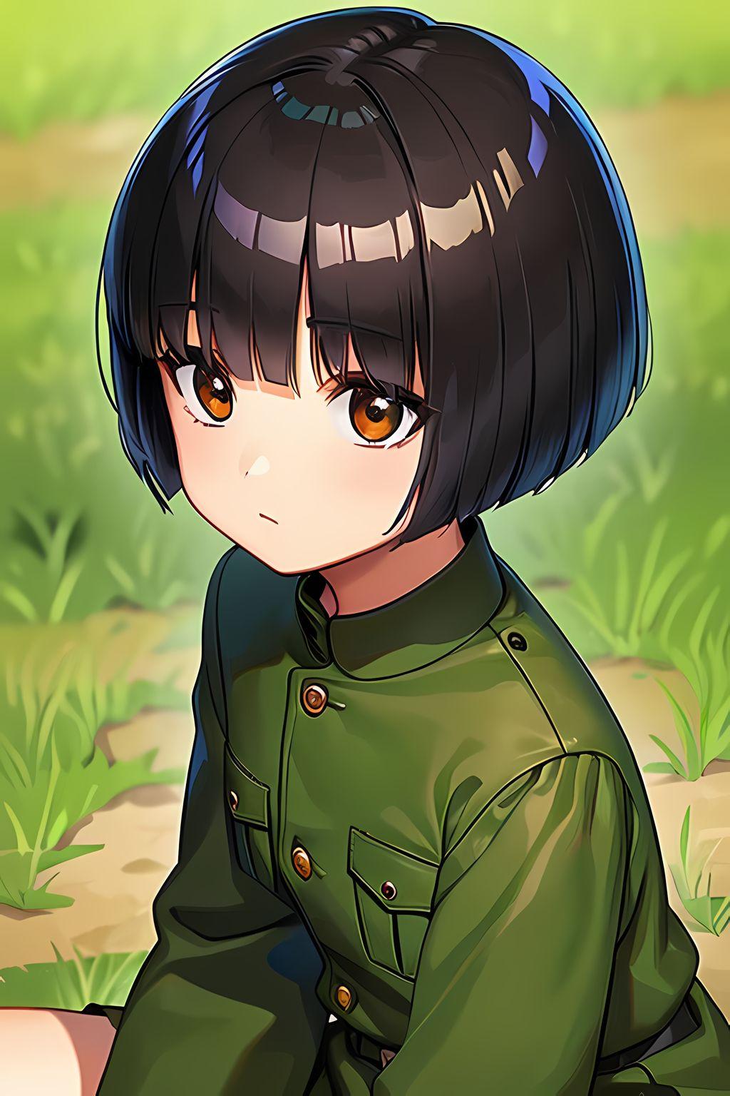 女の子はいつもの黒髪ポニーの茶瞳っ娘のピクシーカット、マスピ外しVer