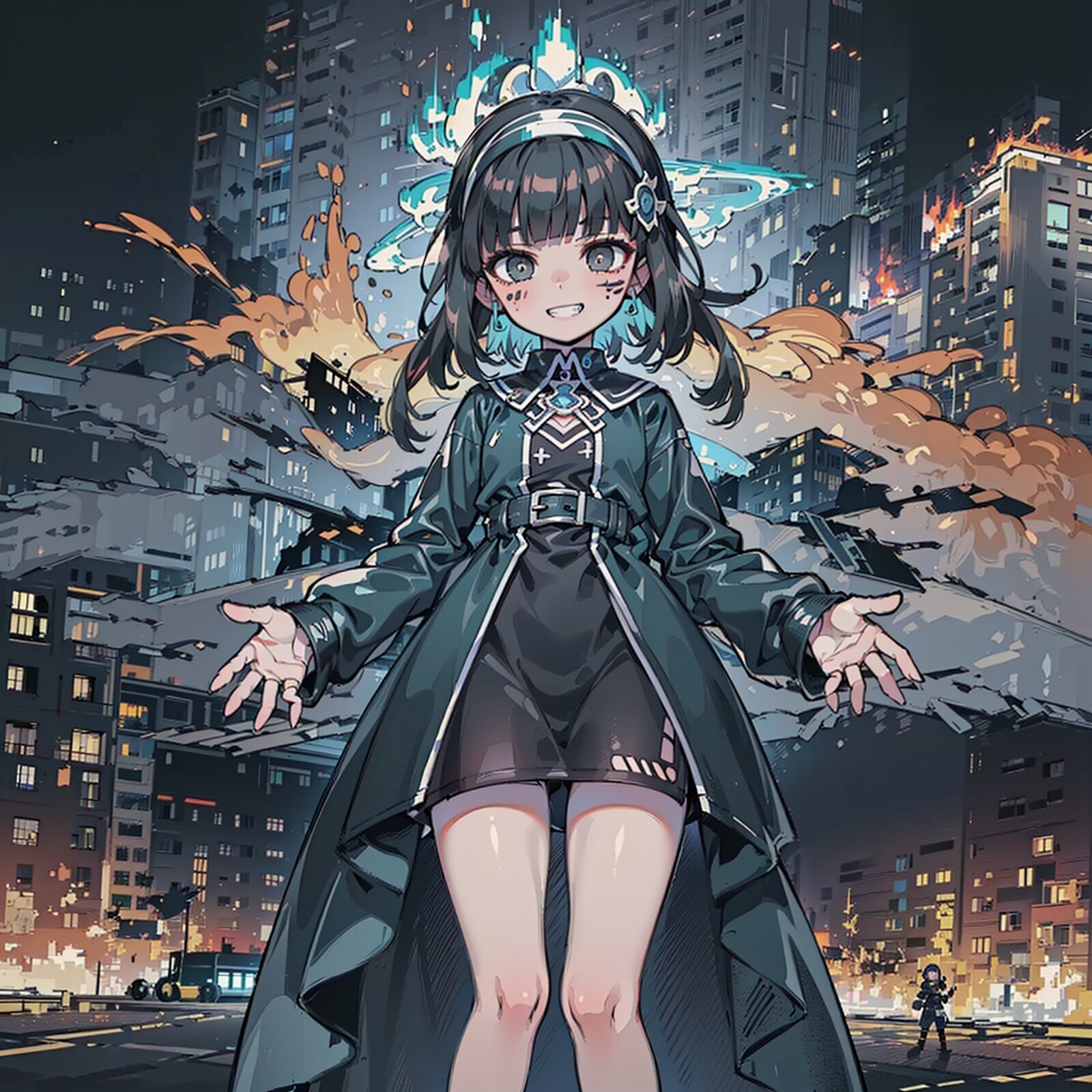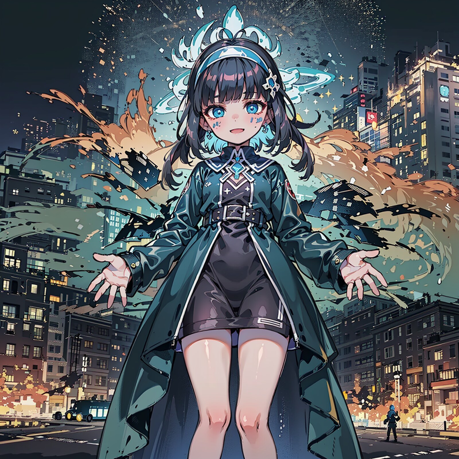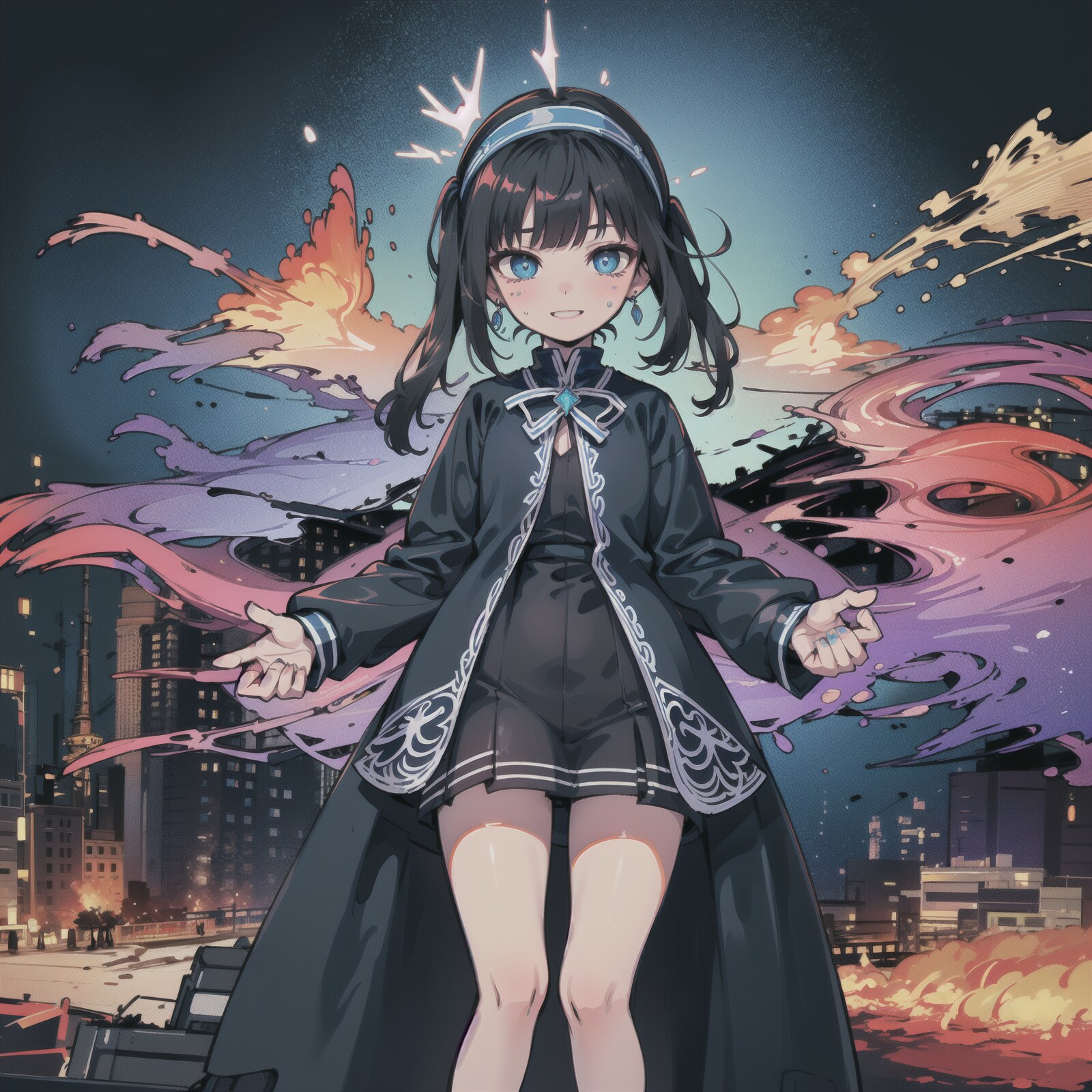 ■3枚目 Hires.fixで2倍にアップスケールしたものですが、作風やエフェクト関連のプロンプトで背景の街はほとんど反映されず、指もぐにゃってしまったものです。