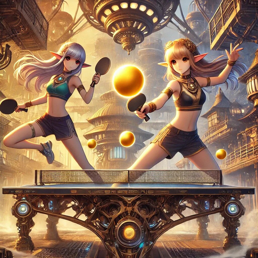 ・エルフ少女たちは伝統的なエルフ耳を持ちながらも、腕にスチームパンク風のブースター装置を装備し、卓球の試合で加速する。