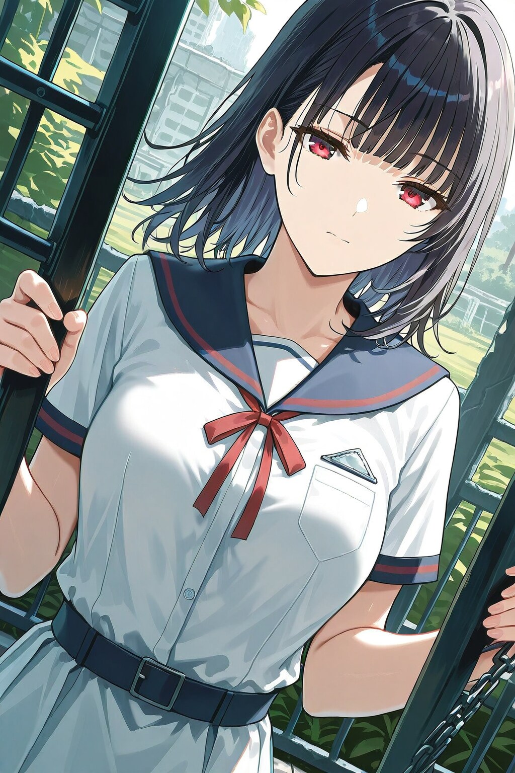 ししょちゃんは、封鎖された鉄格子の門の前に立っている。彼女はGPU学園に新入生として入学したばかり。長い髪はデータの光を反射し、整った制服は学園の秩序を体現する。だが、彼女の瞳には好奇心と、どこか言いようのない不安が宿っている。