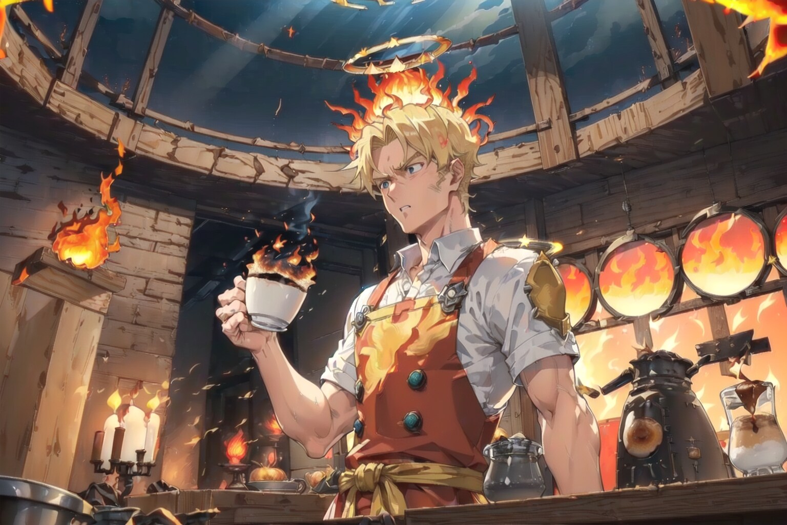 コーヒーカップから燃え盛る炎が上がる、まさにフレイム!