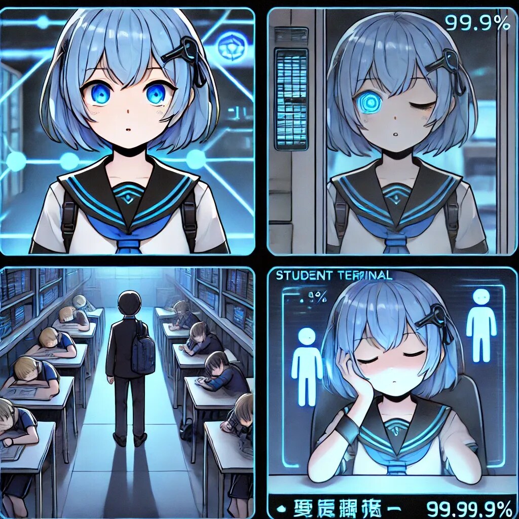 → 学校内を巡回する青ぽにちゃんは、管理AIの端末として冷静に機能チェックをしており、完璧に統制された世界で異常を探している様子です。