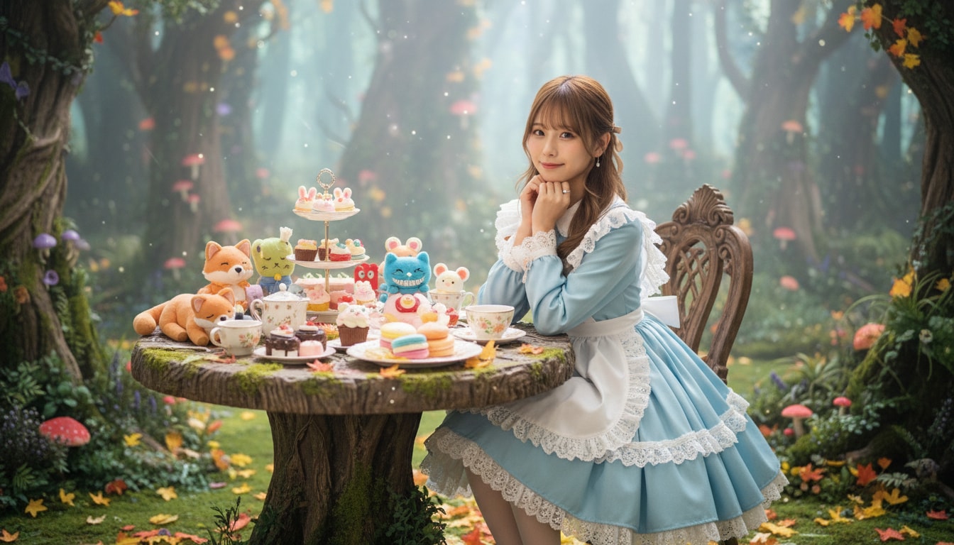 「あわわ…!カフェの裏口だと思ったら、不思議の国に来ちゃいました!」 「でも、こんなに可愛いスイーツとぬいぐるみが…!天国です!」