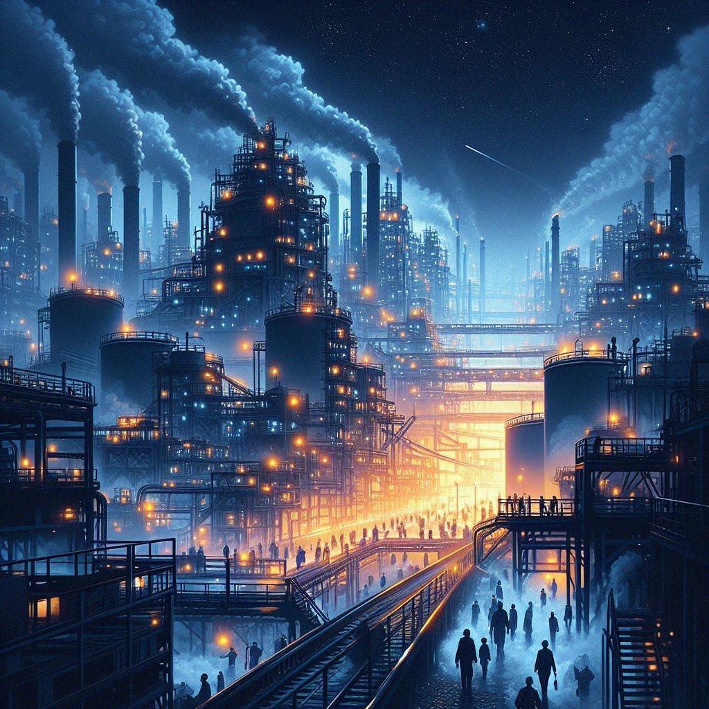 「暗闇の中で、無数の工場が赤や青や黄色の光を放っている。