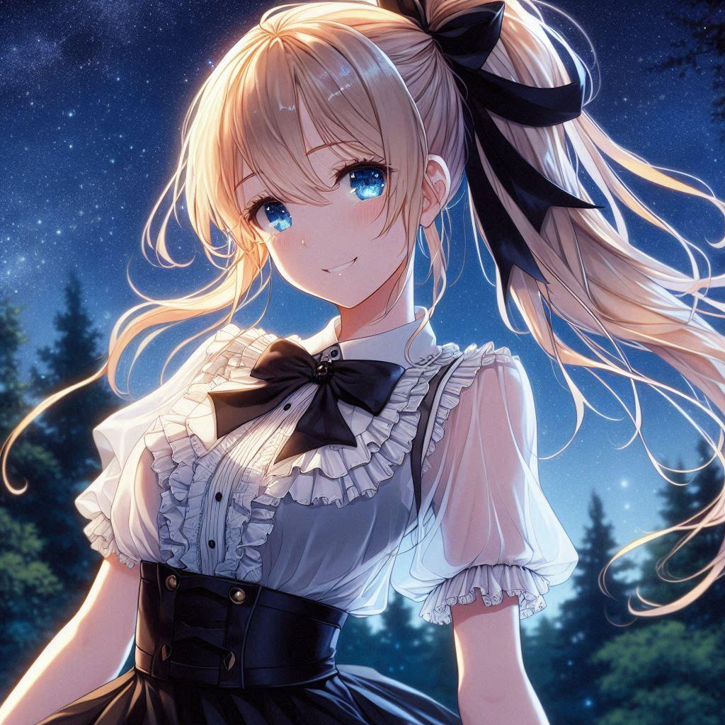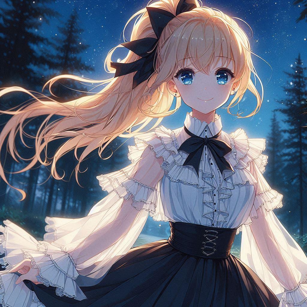 白いフリルブラウスと黒いハイタイトスカートが特徴の英国少女。背景プロンプトは省略しています。