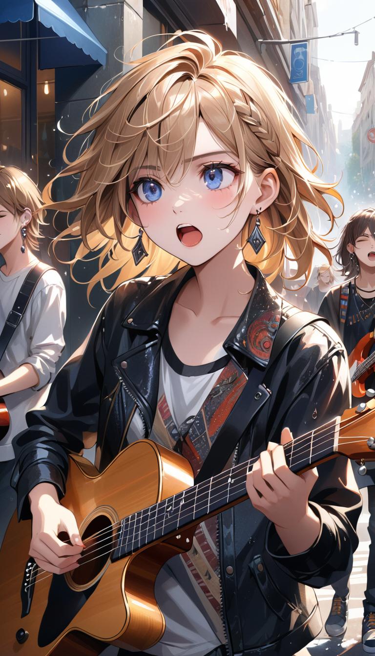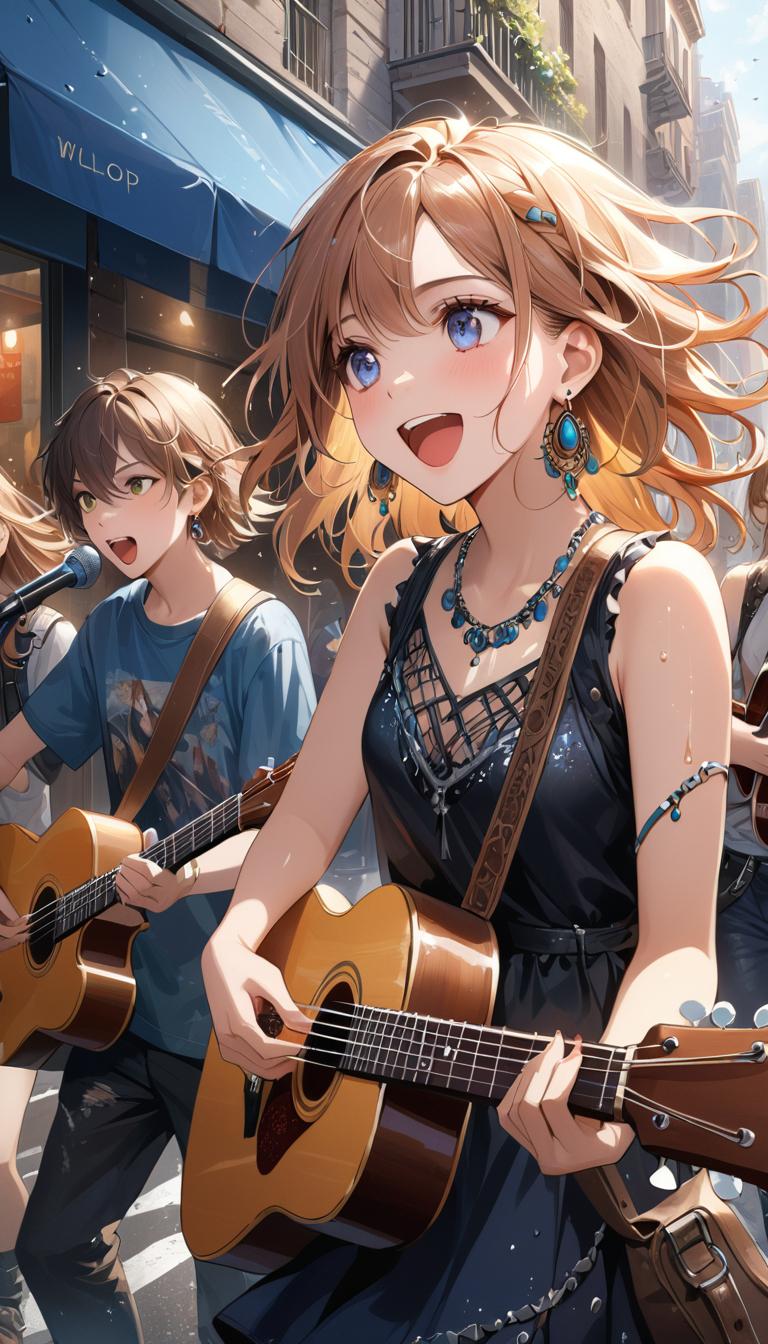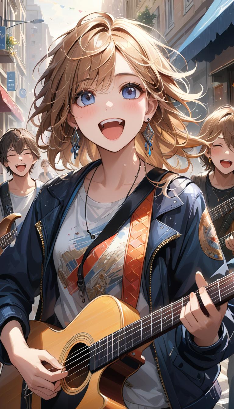 路上でロック系ファッションで楽器を演奏しながら歌いまくる幸せな若者たち