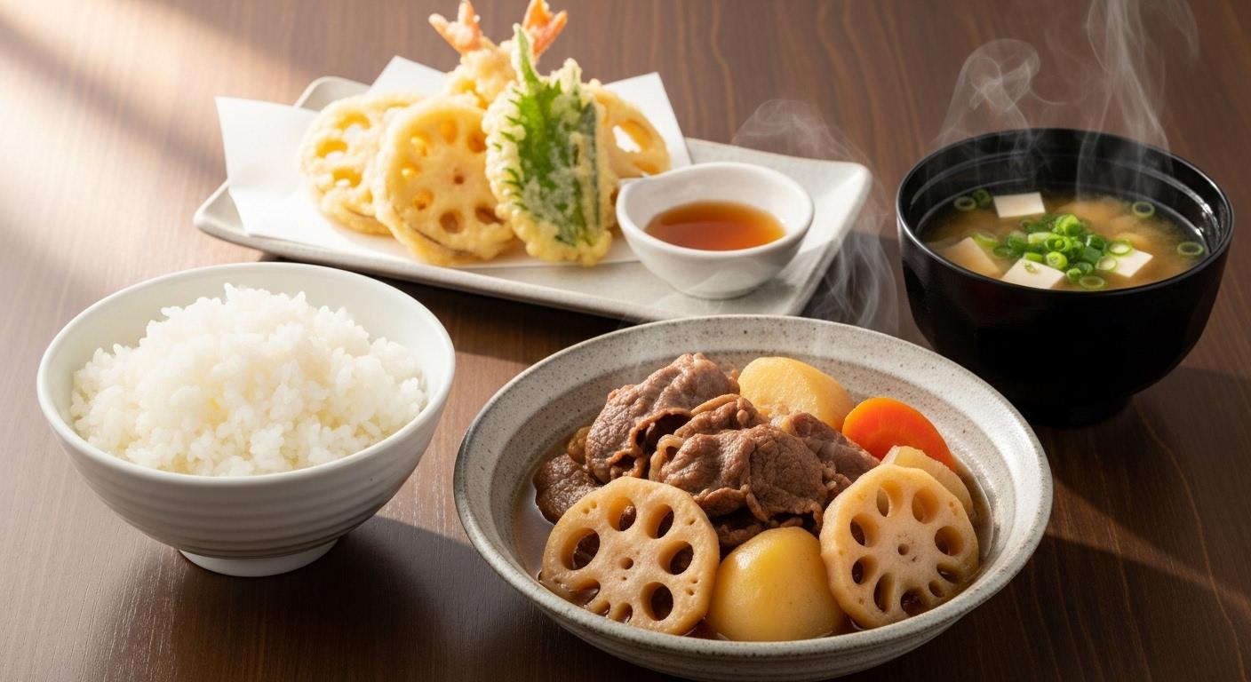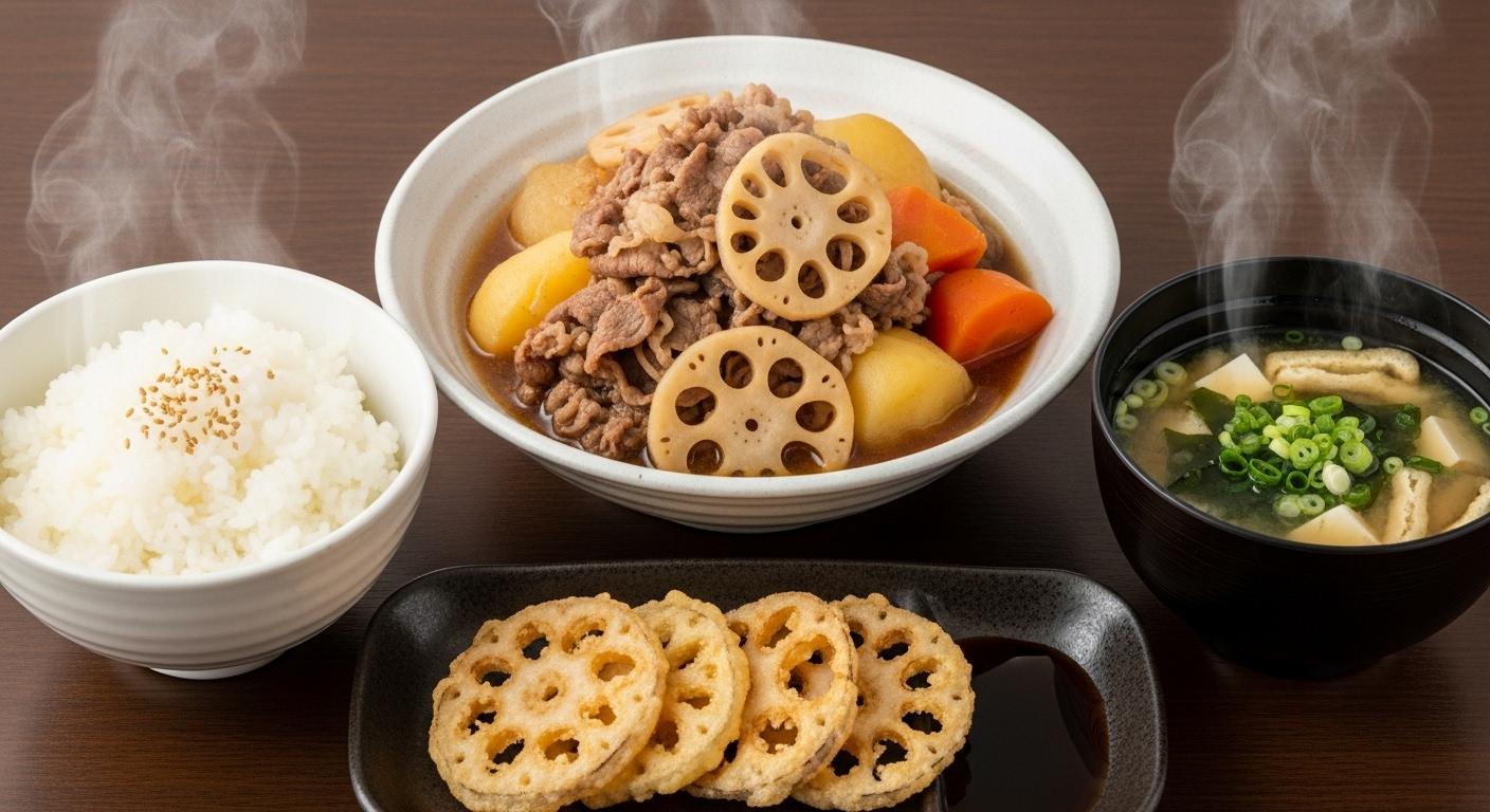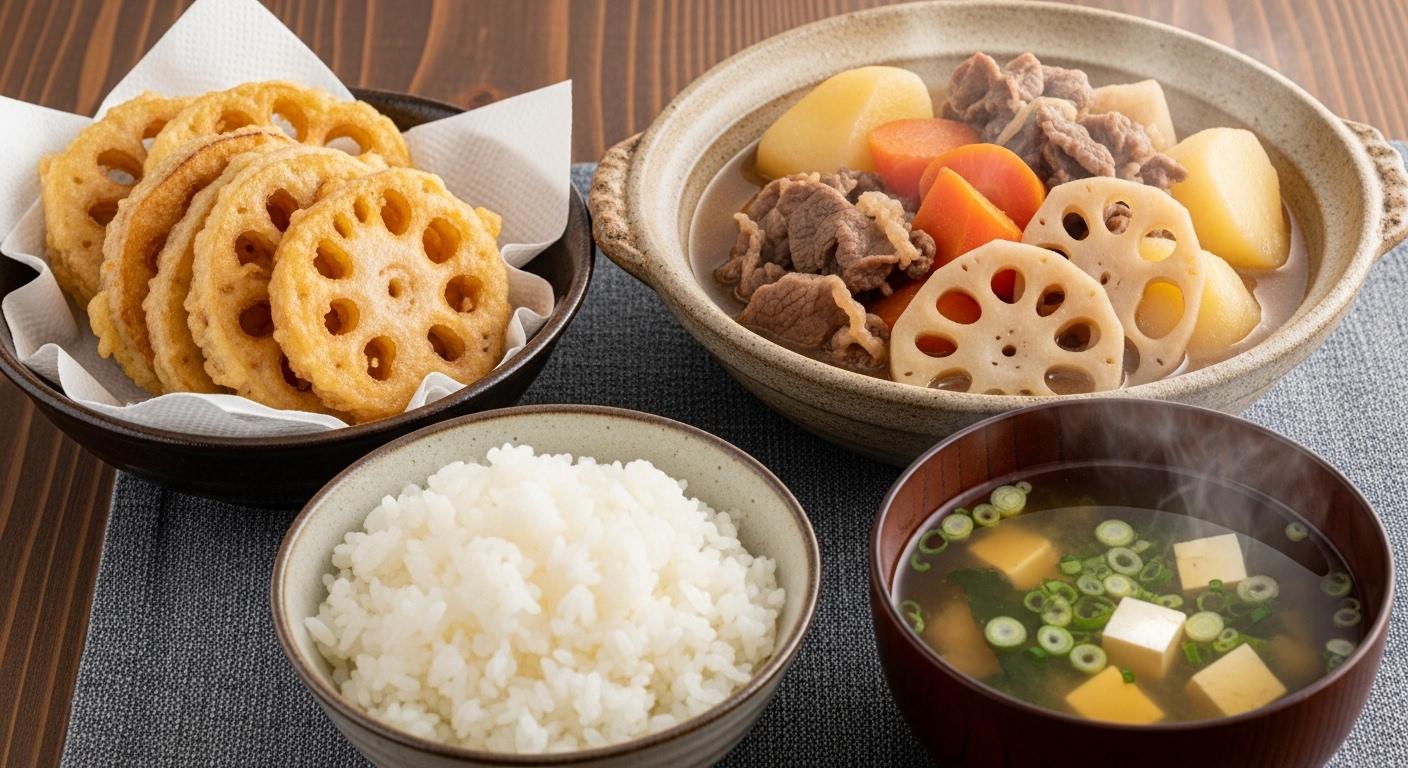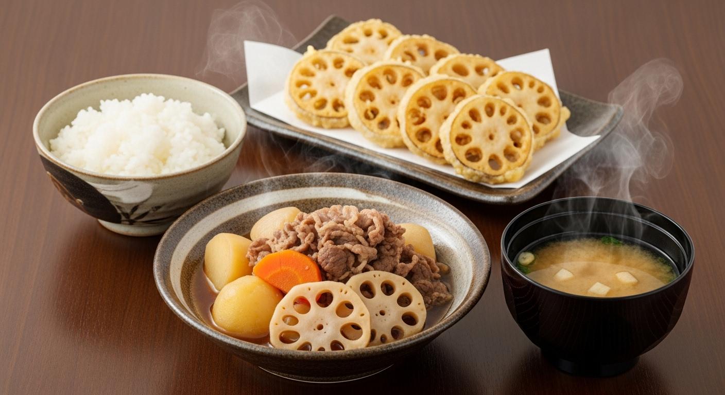 内容は、蓮根入り肉じゃが、蓮根の天麩羅、米飯、味噌汁で御座います。