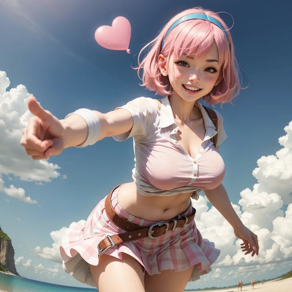 カフェの前で元気にポーズを取るピンク髪の女性。太陽が彼女のフレンドリーな笑顔を明るく照らし、ビビッドな色合いの制服が活発な雰囲気をさらに強調しています。動きのある姿勢と背景のカフェの風景が、都会の生活の活気を伝えます。