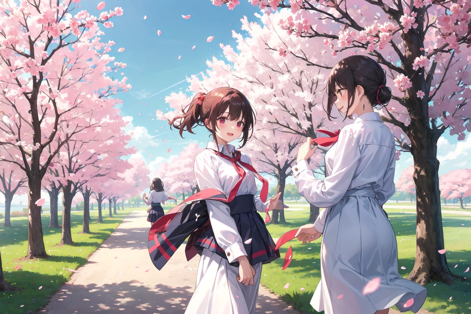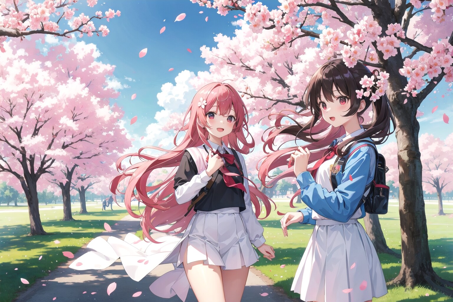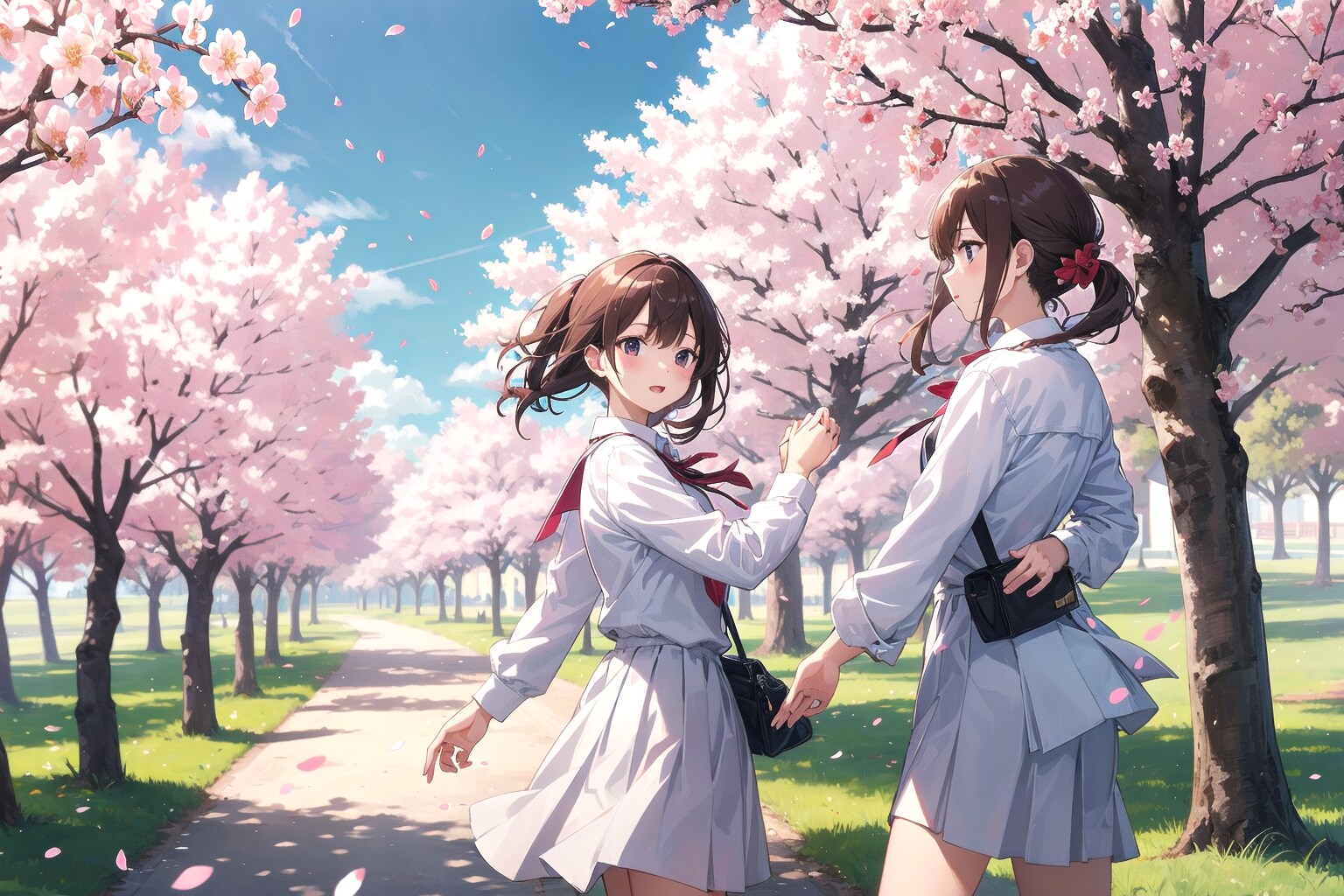 3:手がまだ破綻しているし、制服も運の問題ではなくこのままだとずっと制服っぽくなさそう。そこで次の2を生成する際には、プロンプトの「girls wearing school uniform」を「girls wearing black school uniform」に変更し、ネガティブプロンプトに「bad finger」を入れてみた。