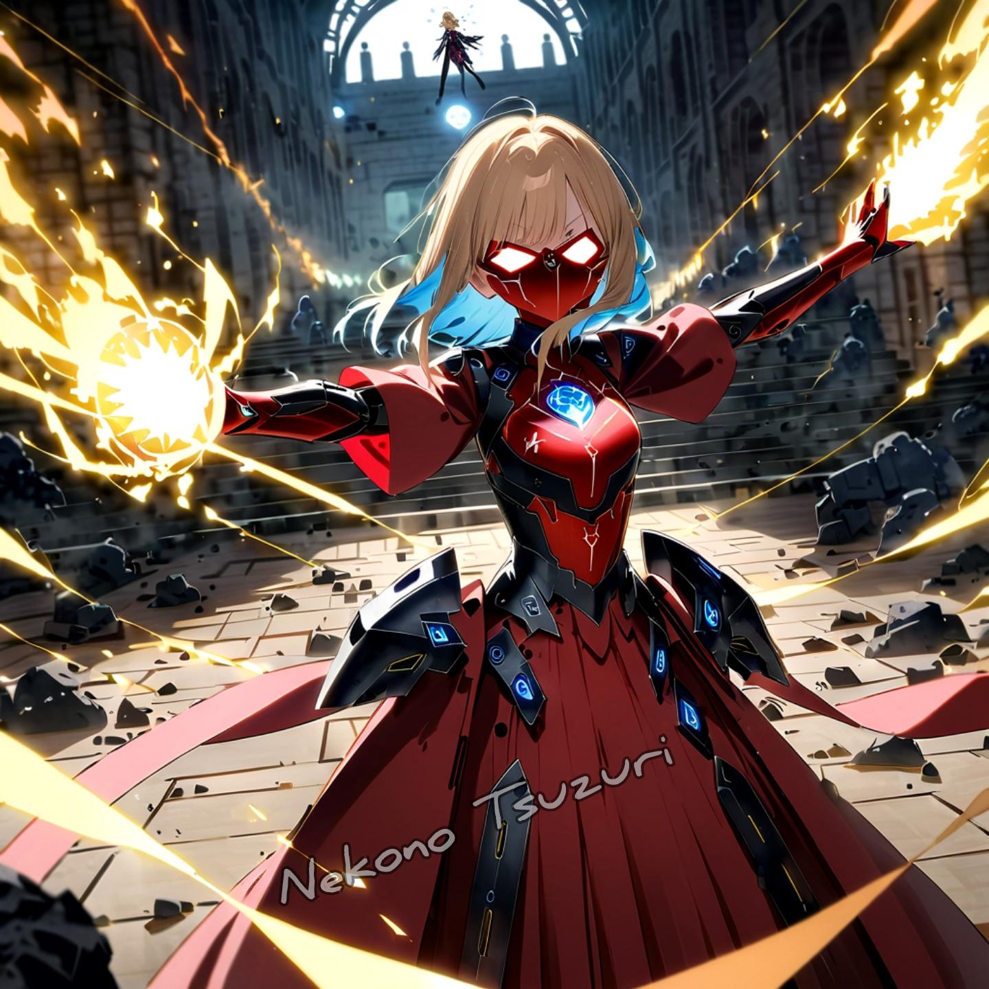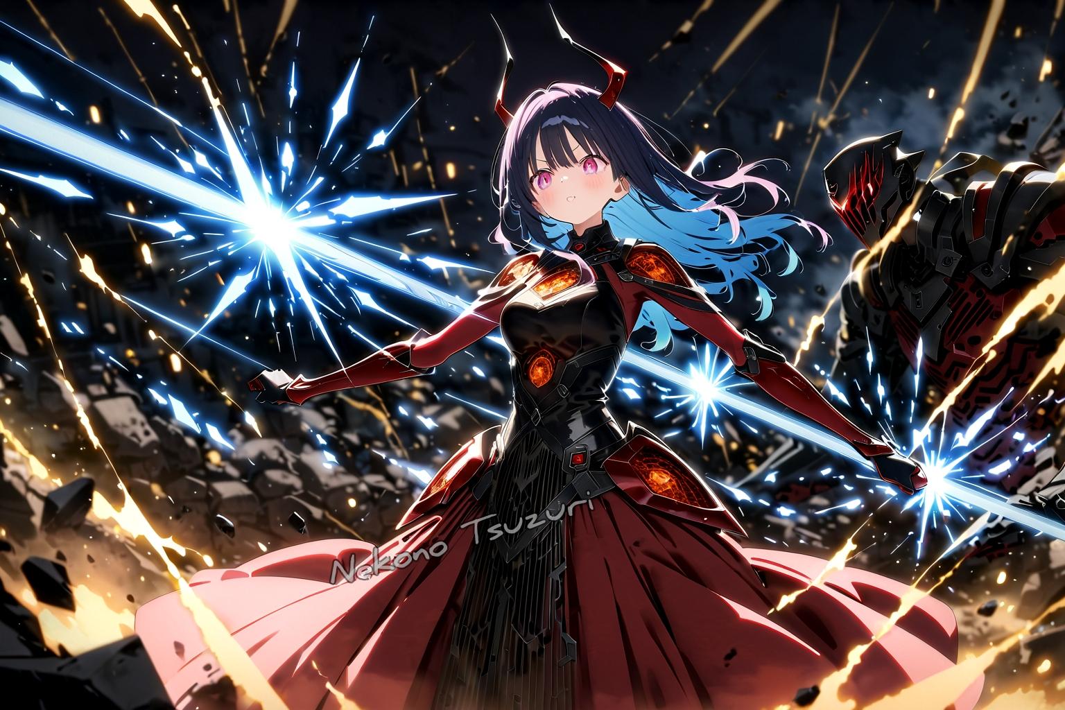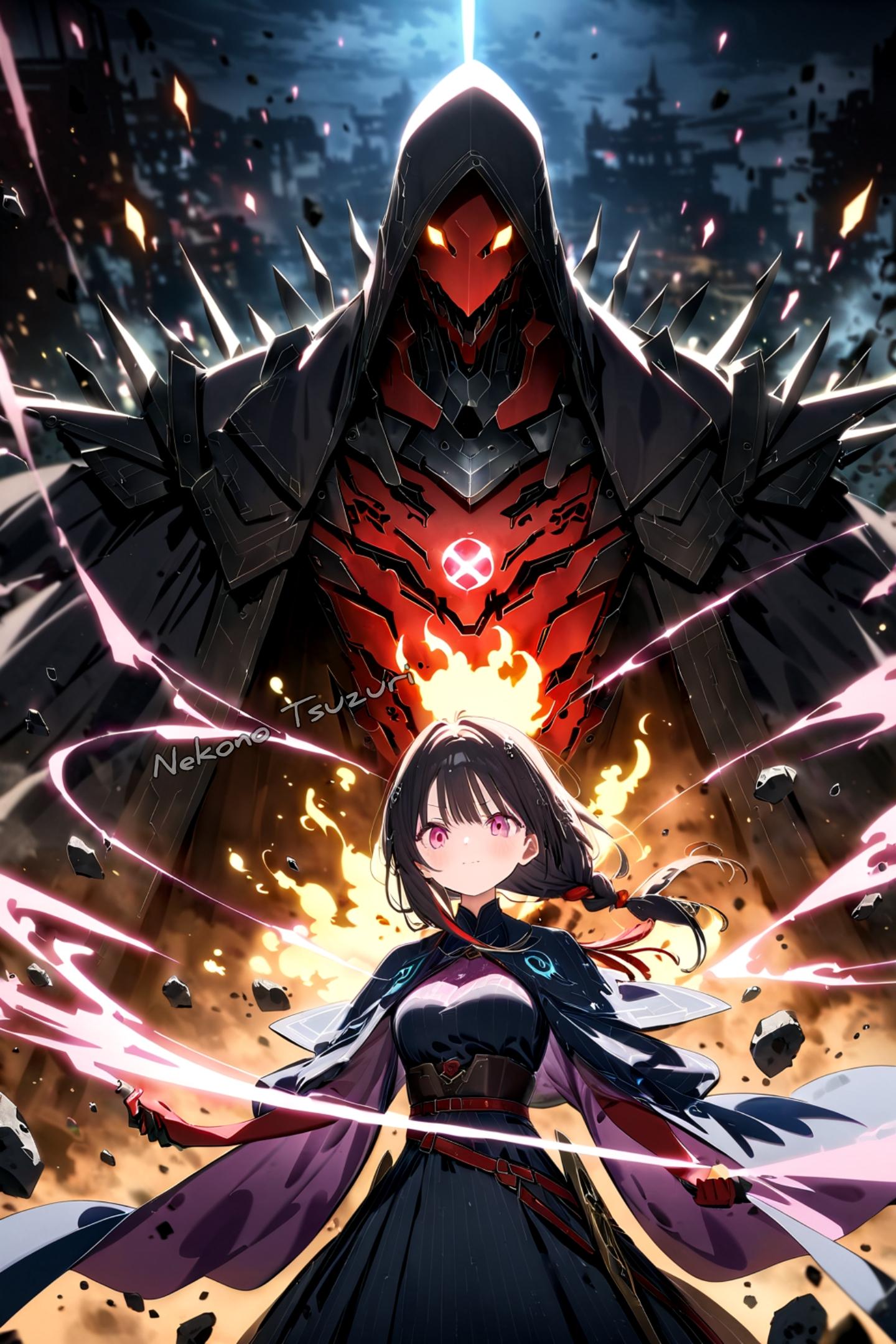 score up_9,score up_8,score up_7,source_anime,masterpiece,best quality,super detailed,super fine illustration,8k,邪悪な精霊のイラスト。キャラクターは邪気のあるエーテルのような体を持ち、機械の要素と一体化したデザイン。彼女の髪や衣装は闇や鋼、鉄のように鋼鉄で、闇が差し込むたびに瘴気を放っている。精霊の表情は穏やかで、周囲には鉄や残骸、光の粒子が舞っており、神秘的で崩壊的な雰囲気が漂う。