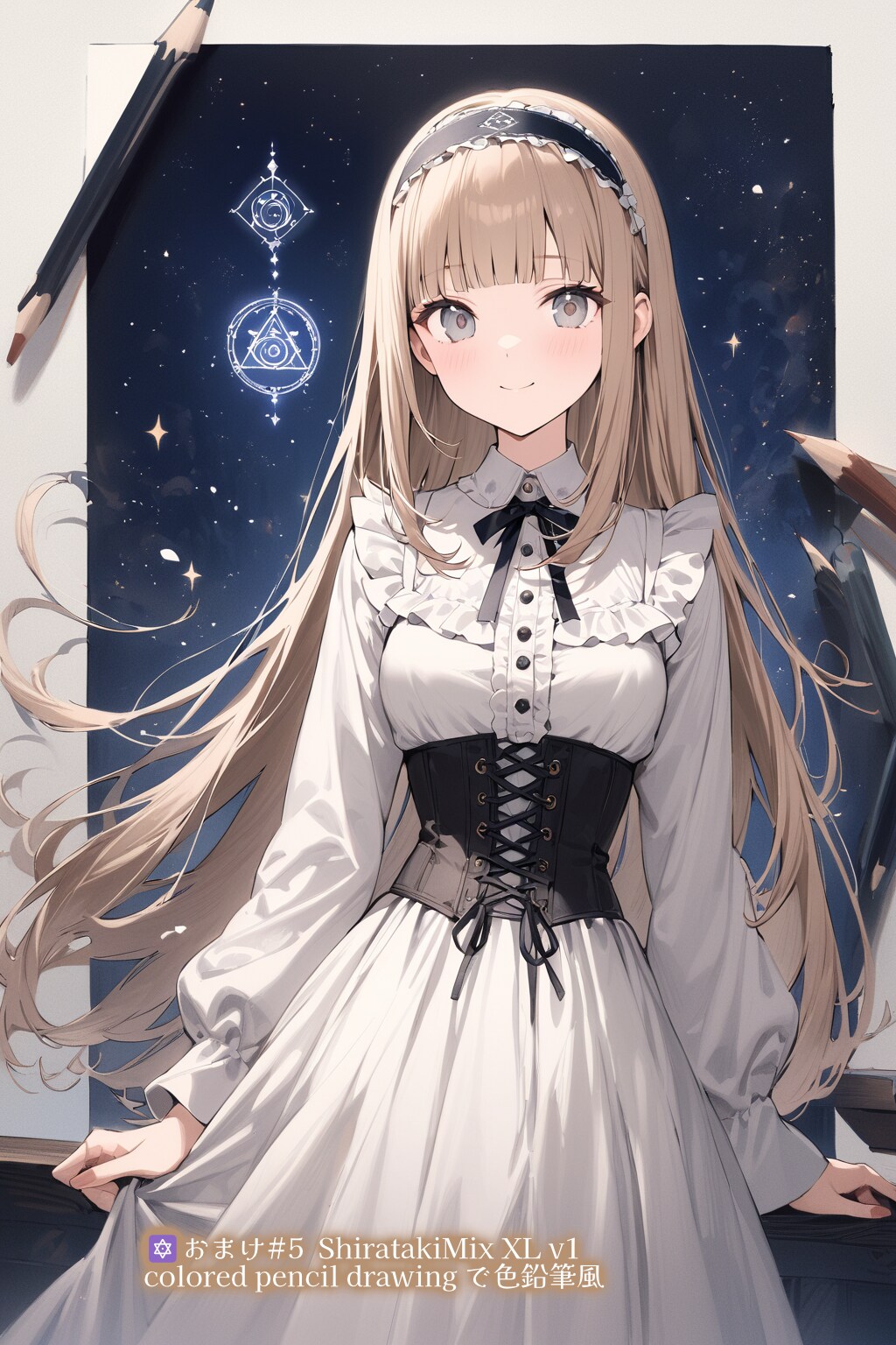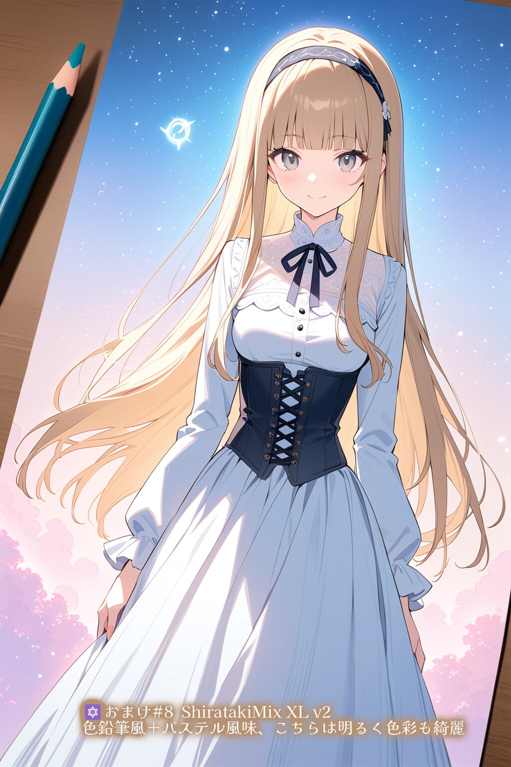 ●#6枚目:v2で同じことをするとアニメ絵・ソシャゲ絵ぽさが強いので、色鉛筆風画風も効きが薄いようです。