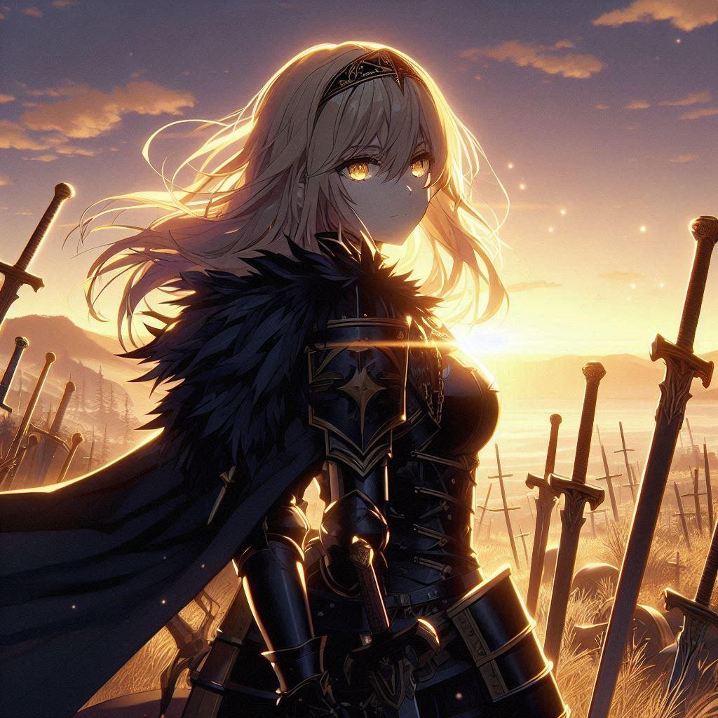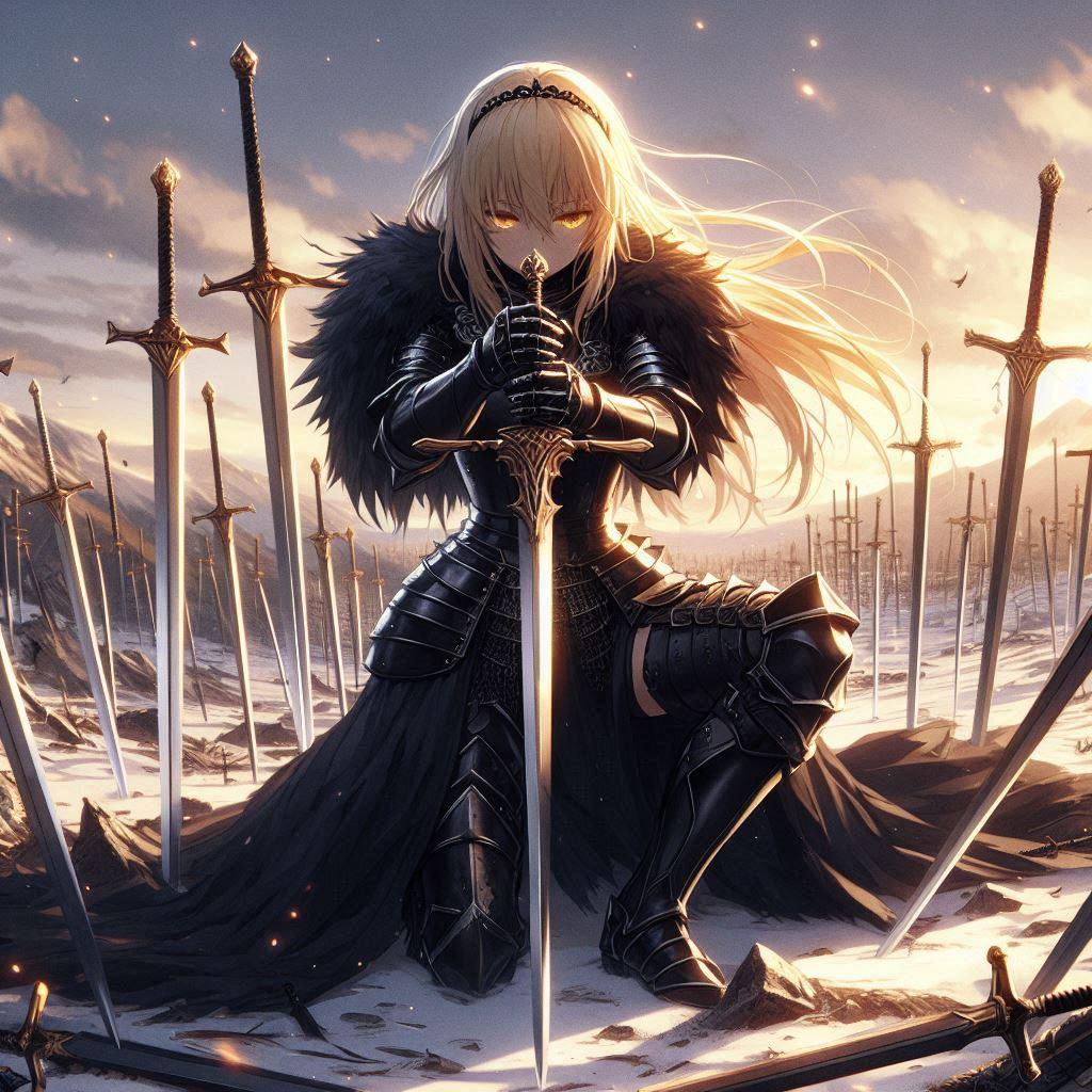 1:戦を終えた戦場跡で一人の騎士が片膝を立てていた。周りには無数の剣がまるで墓標のように突き刺さっている。