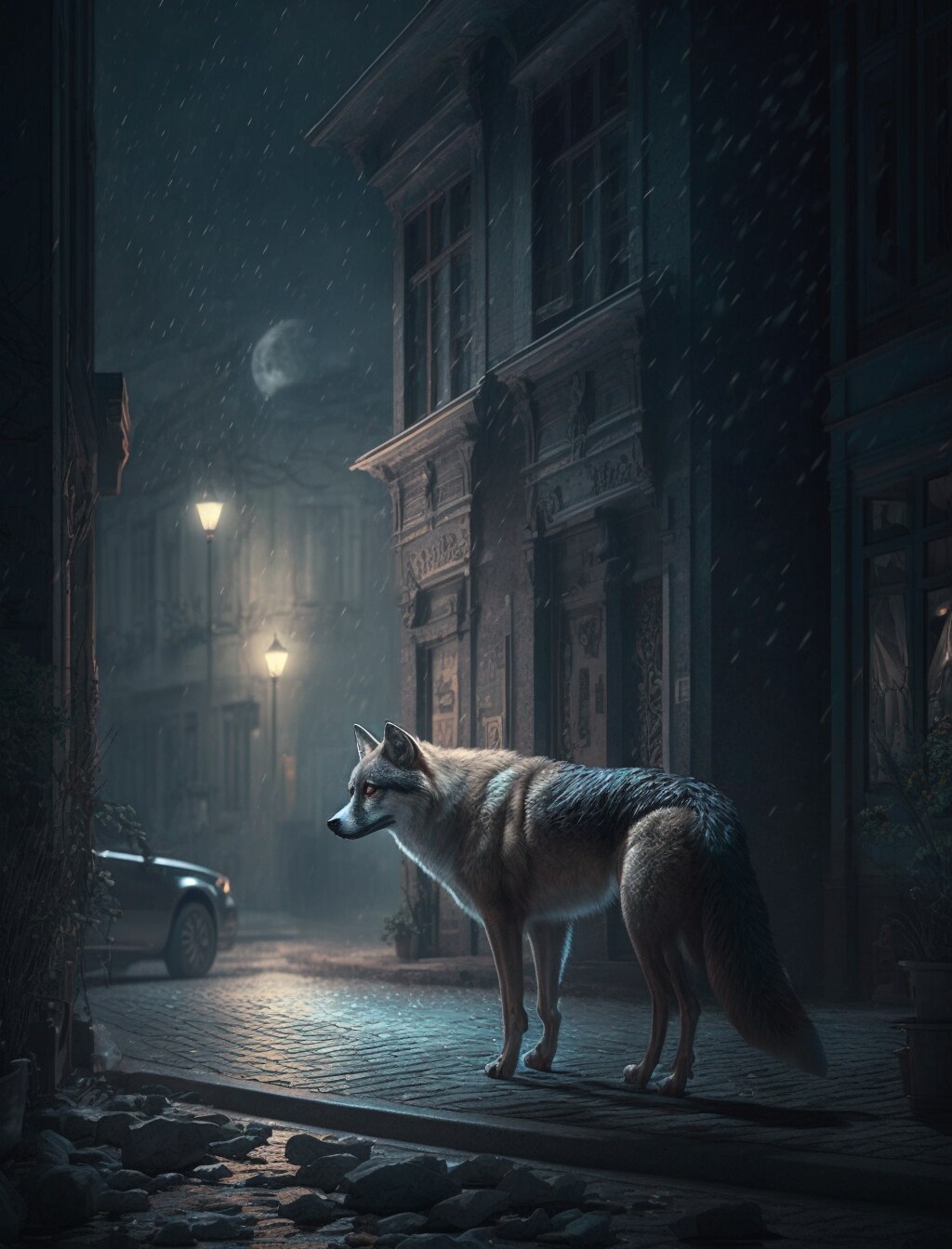 夜の街を散歩する狼
