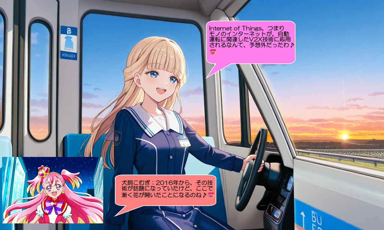 猫屋敷ユキ:Internet of Things、つまりモノのインターネットが、自動運転に関連したV2X技術に応用されるなんて、予想外だったわ♪😍