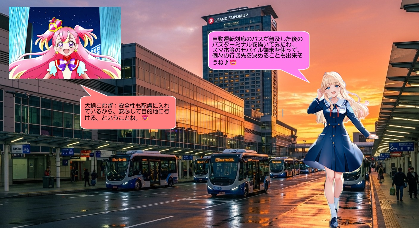 猫屋敷ユキ:自動運転対応のバスが普及した後のバスターミナルを描いてみたわ。