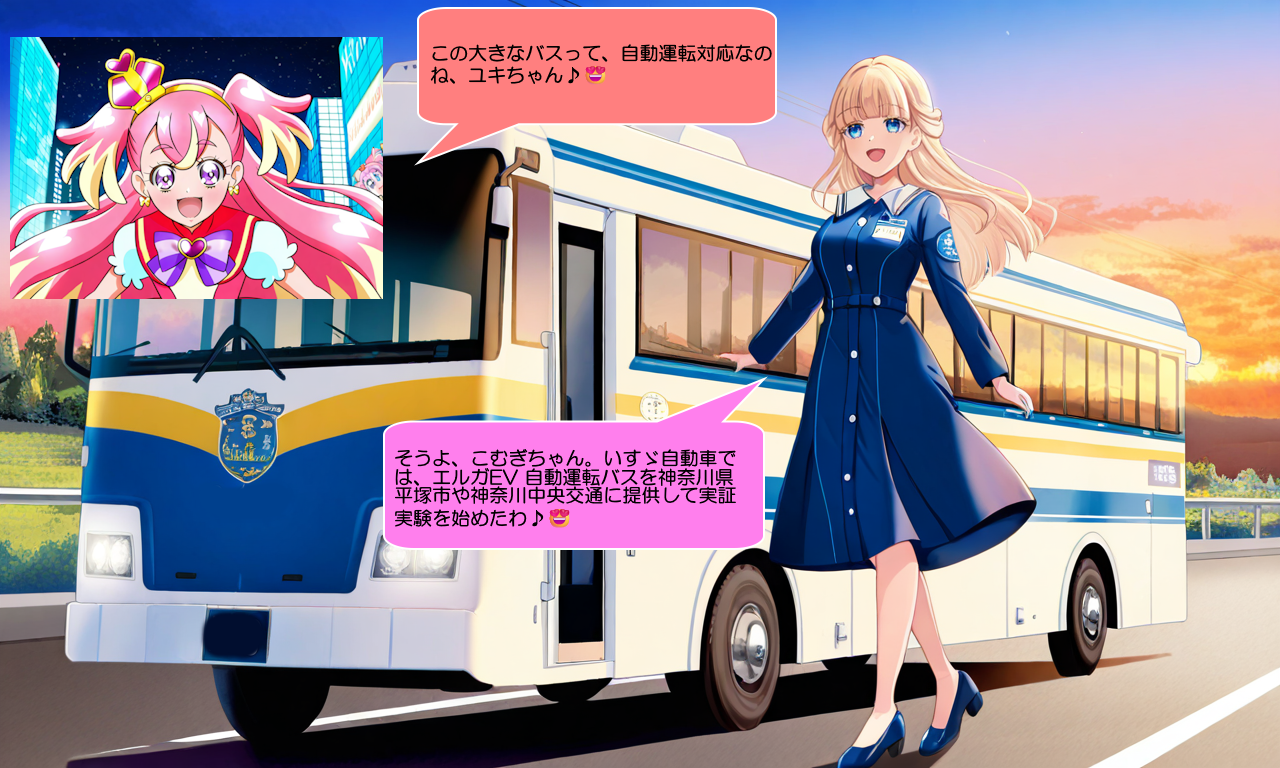 猫屋敷ユキ:そうよ、こむぎちゃん。いすゞ自動車では、エルガEV 自動運転バスを神奈川県平塚市や神奈川中央交通に提供して実証実験を始めたわ♪😍