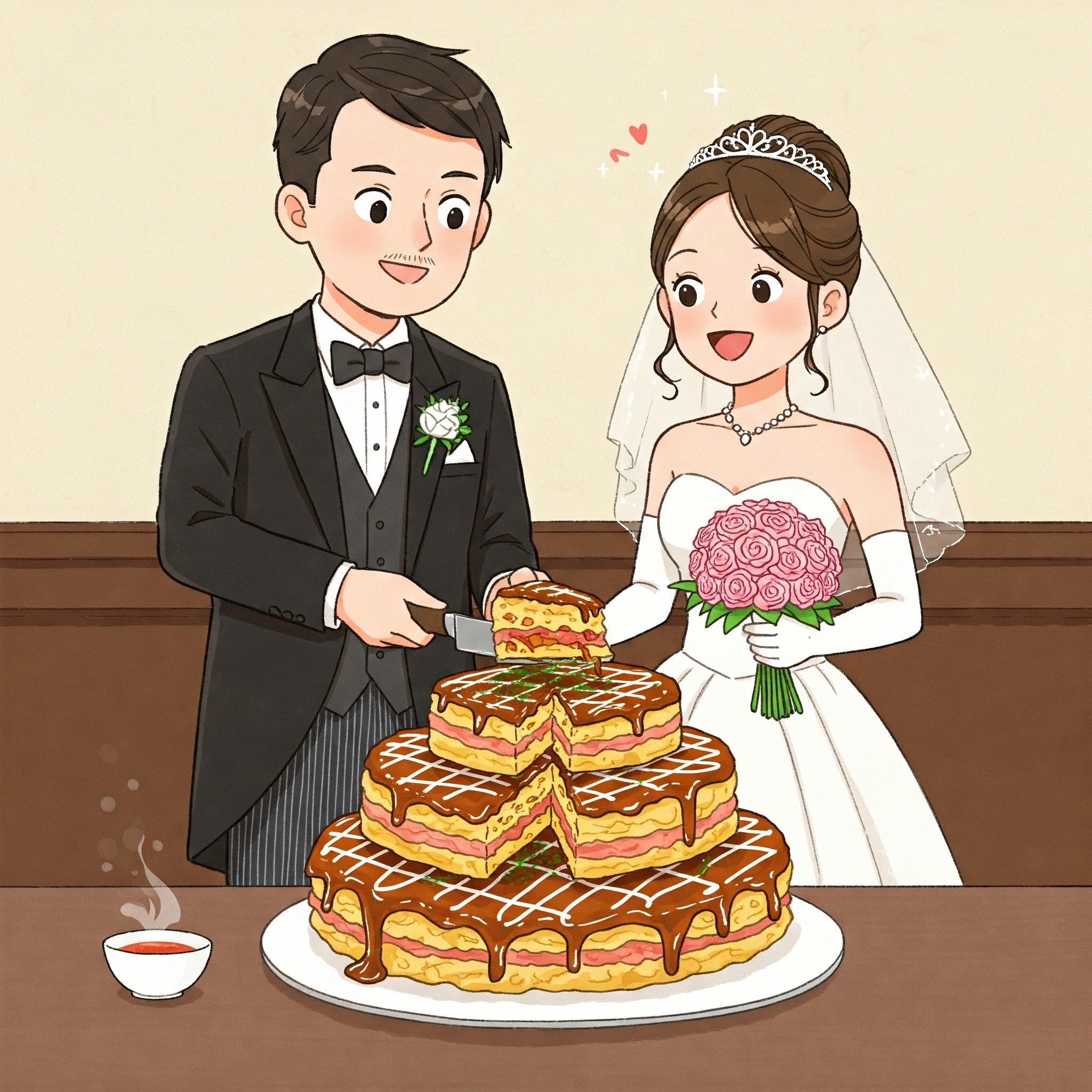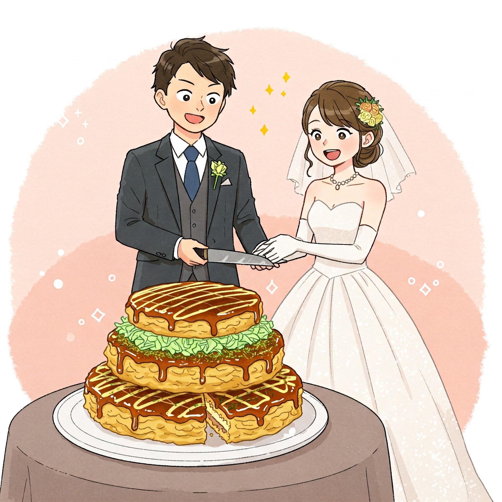 思いついた時に調べたら本当にあるみたいですよ。お好み焼きそのものだったり、それを模したウェディングケーキだったり(笑)