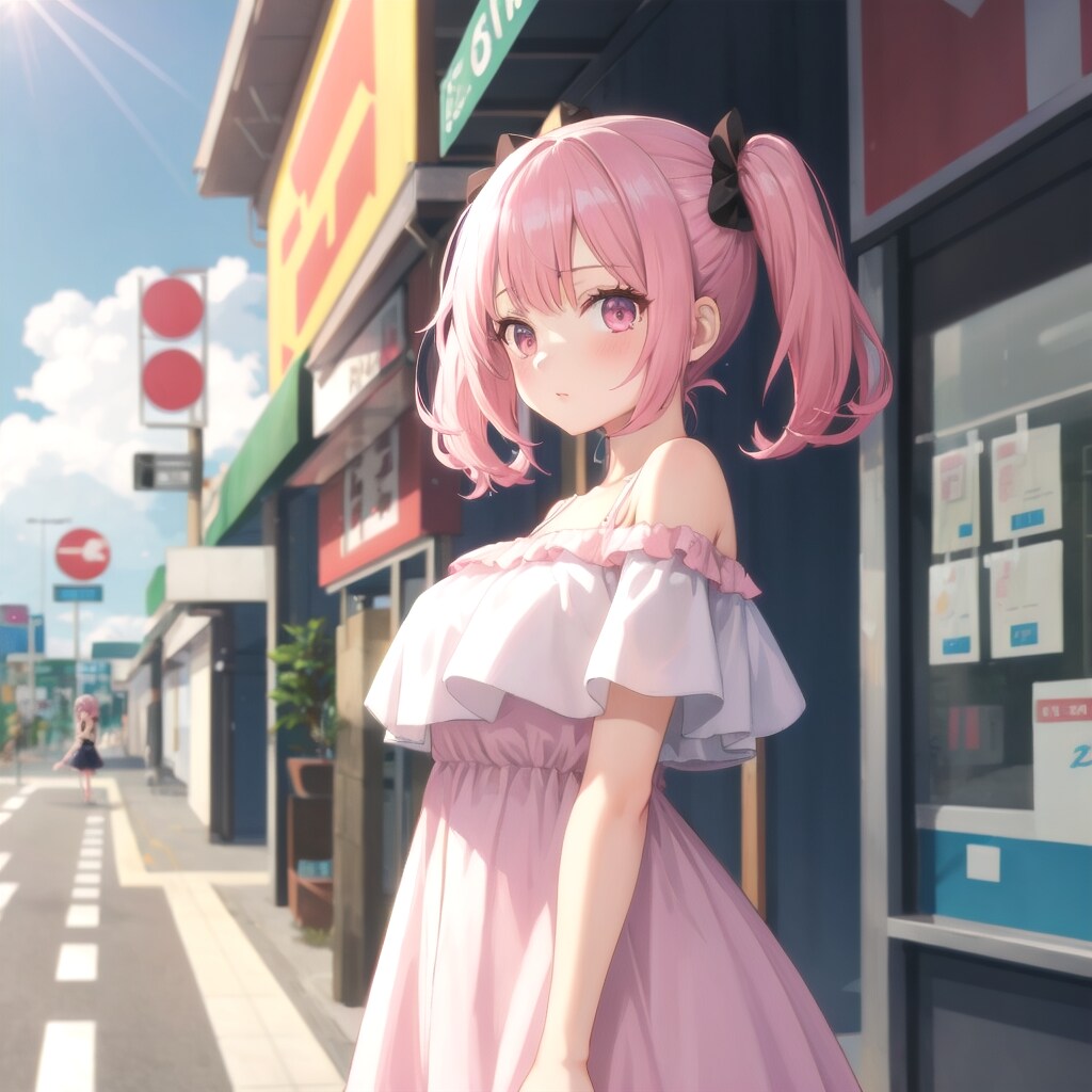 (ピンク髪、オフショル}