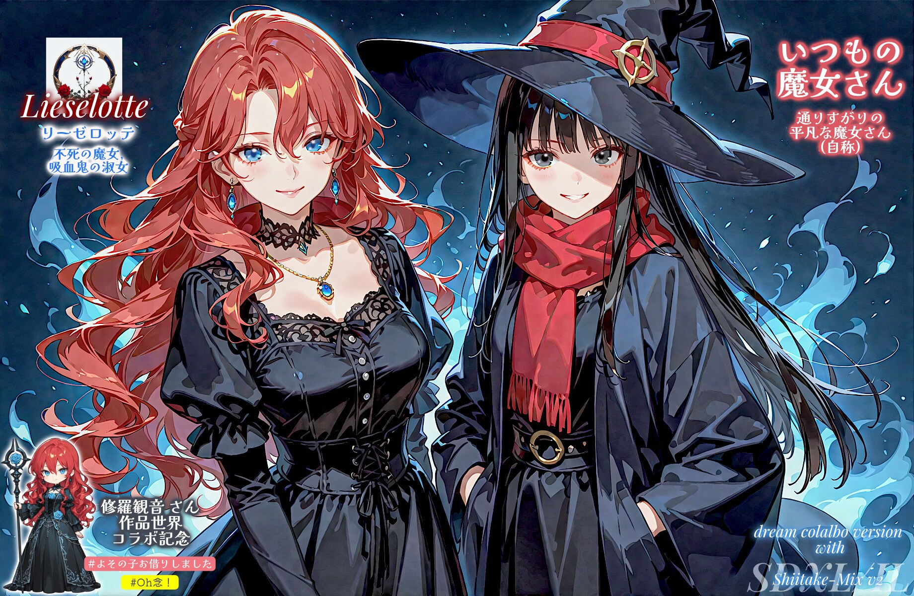 ・頂いた元のコラボ絵の通り、左側のリーゼロッテの方が大人で背が高そうなイメージですが、今回作品だと同じぐらいになっちゃいました。これはきっといつもの魔女さんは大きな魔女の帽子で背が高く見えているんだ...という妄想にするのです。( ˘ω˘ ).。oO