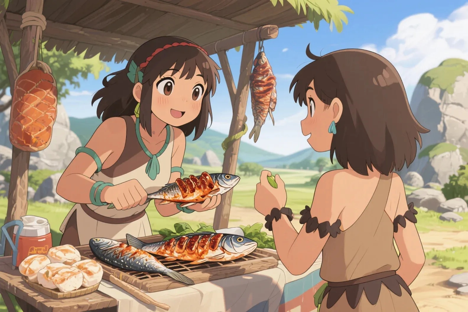 焼き魚を買う石器時代の女の子