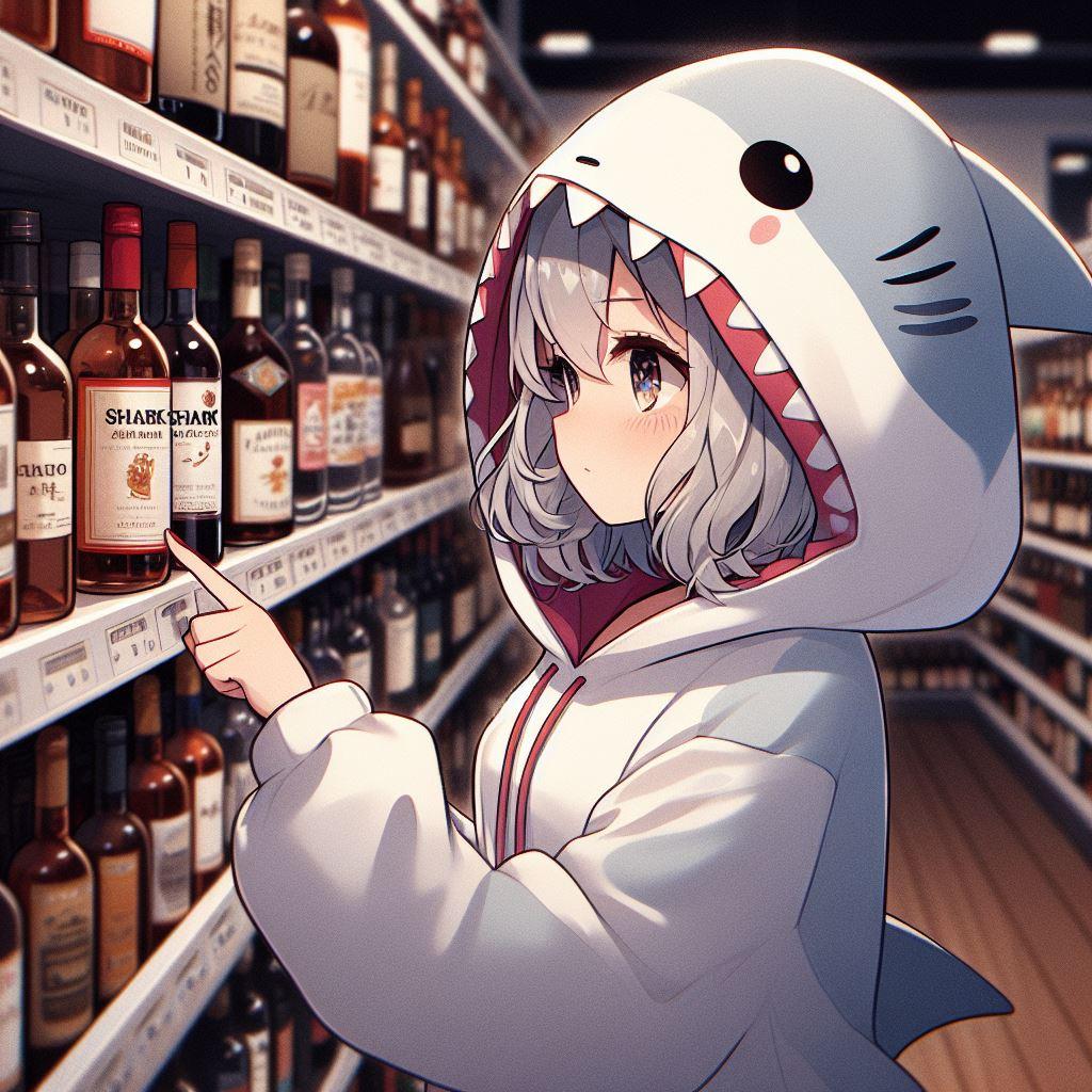 忘年会に持っていくお酒を選んでいるサメちゃん