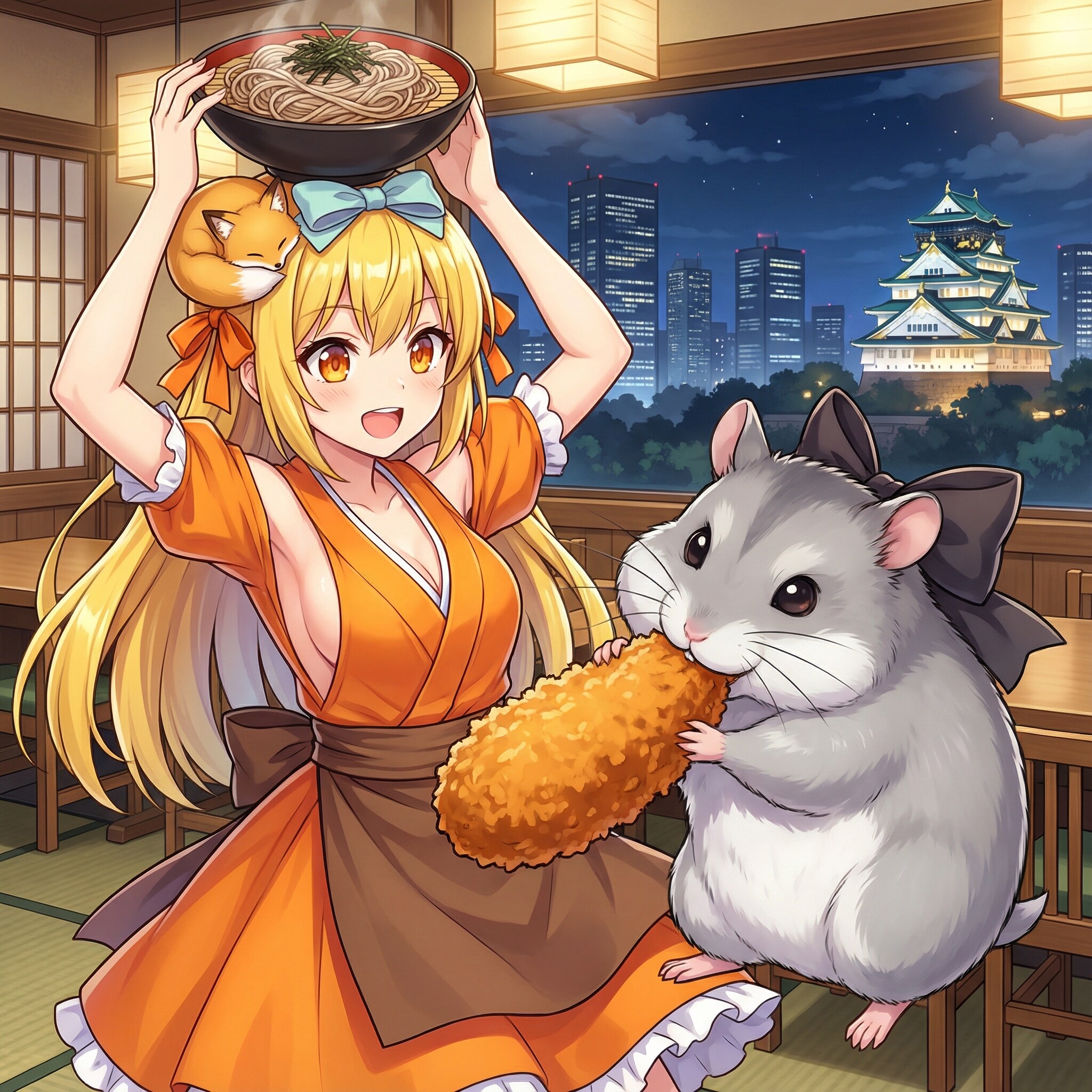 牡蠣フライを取り合う頭に蕎麦を乗せてる系女子と友達のネズミが食べたら毒だからあげちゃダメ系ジャンガリアン