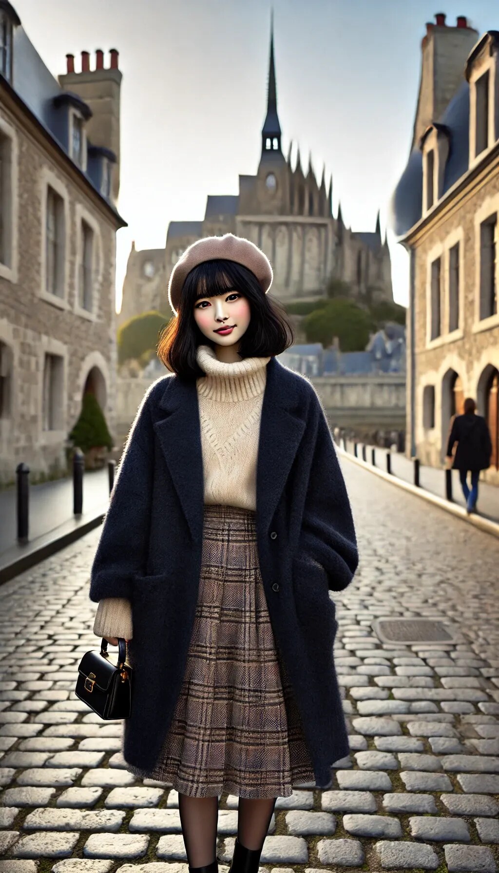渡辺葵さんがモンサンミッシェルの石畳の道で、ネイビーブルーのウールコート、クリーム色のタートルネック、チェック柄のミディスカート、黒のアンクルブーツを着用。ライトブラウンのベレー帽を被り、小さなレザーバッグを持つ。背景には荘厳な修道院が広がる。