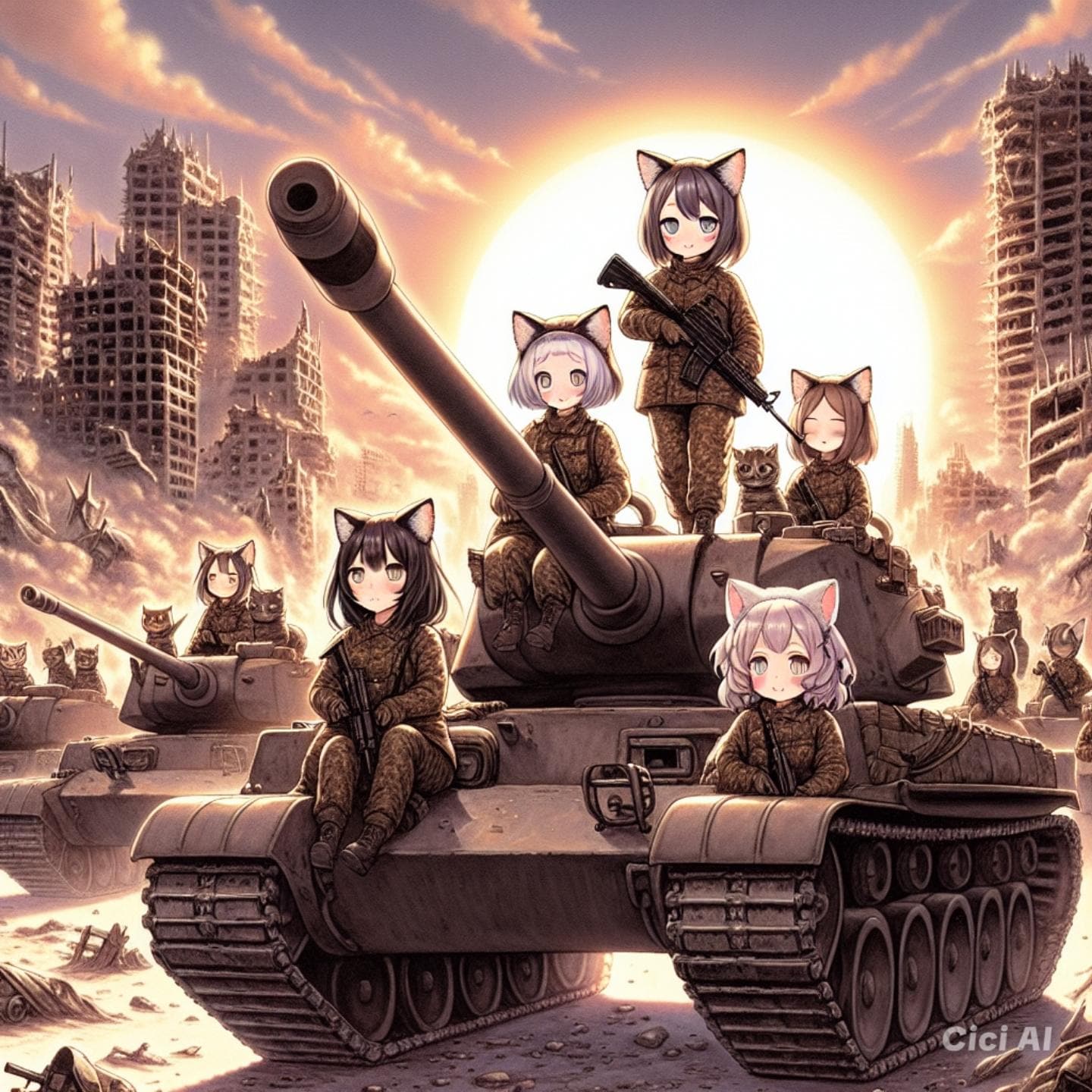 前方を眺める猫耳娘たち。