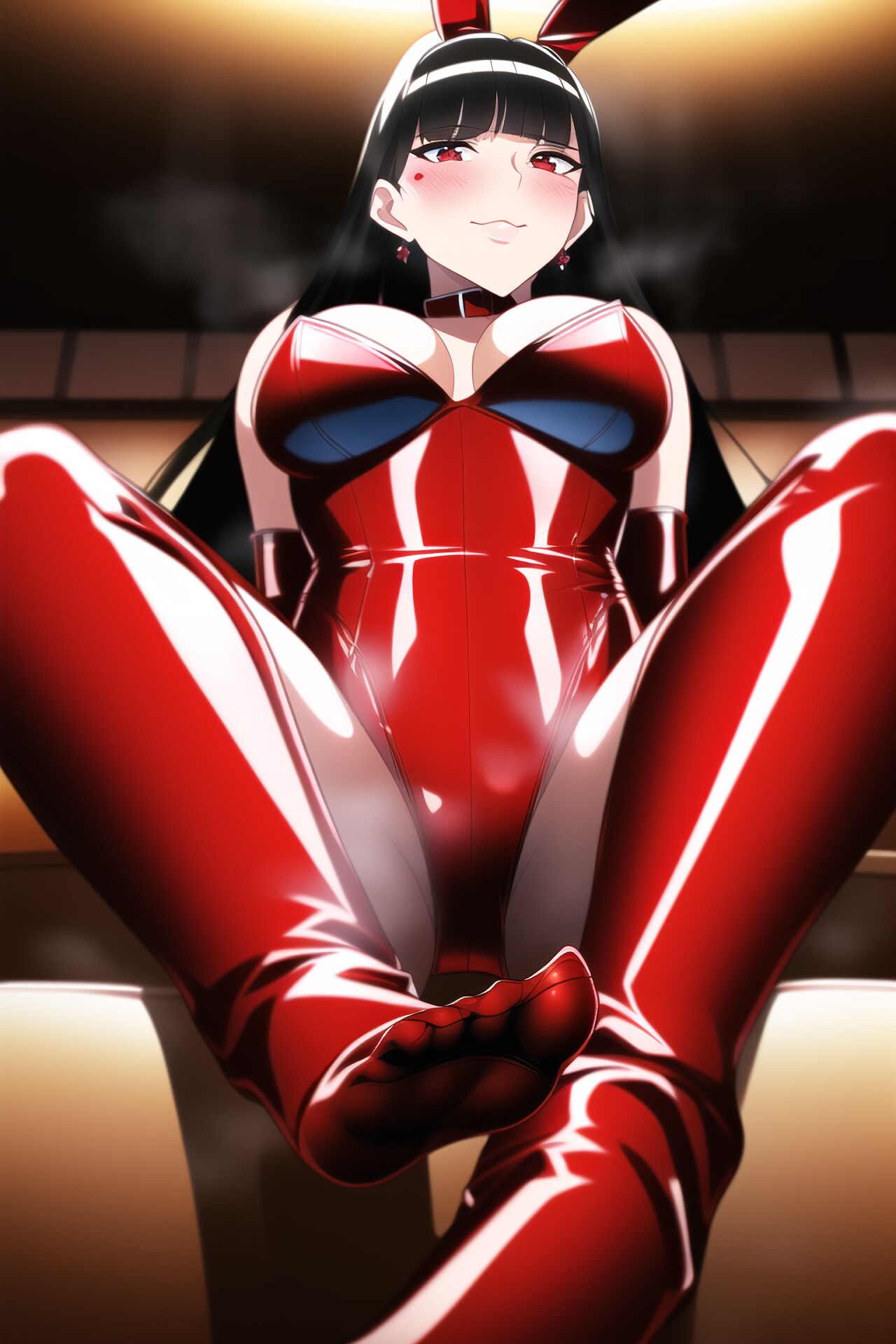 黒髪ロングドSボンデージ赤バニーちゃんに足コキされたい