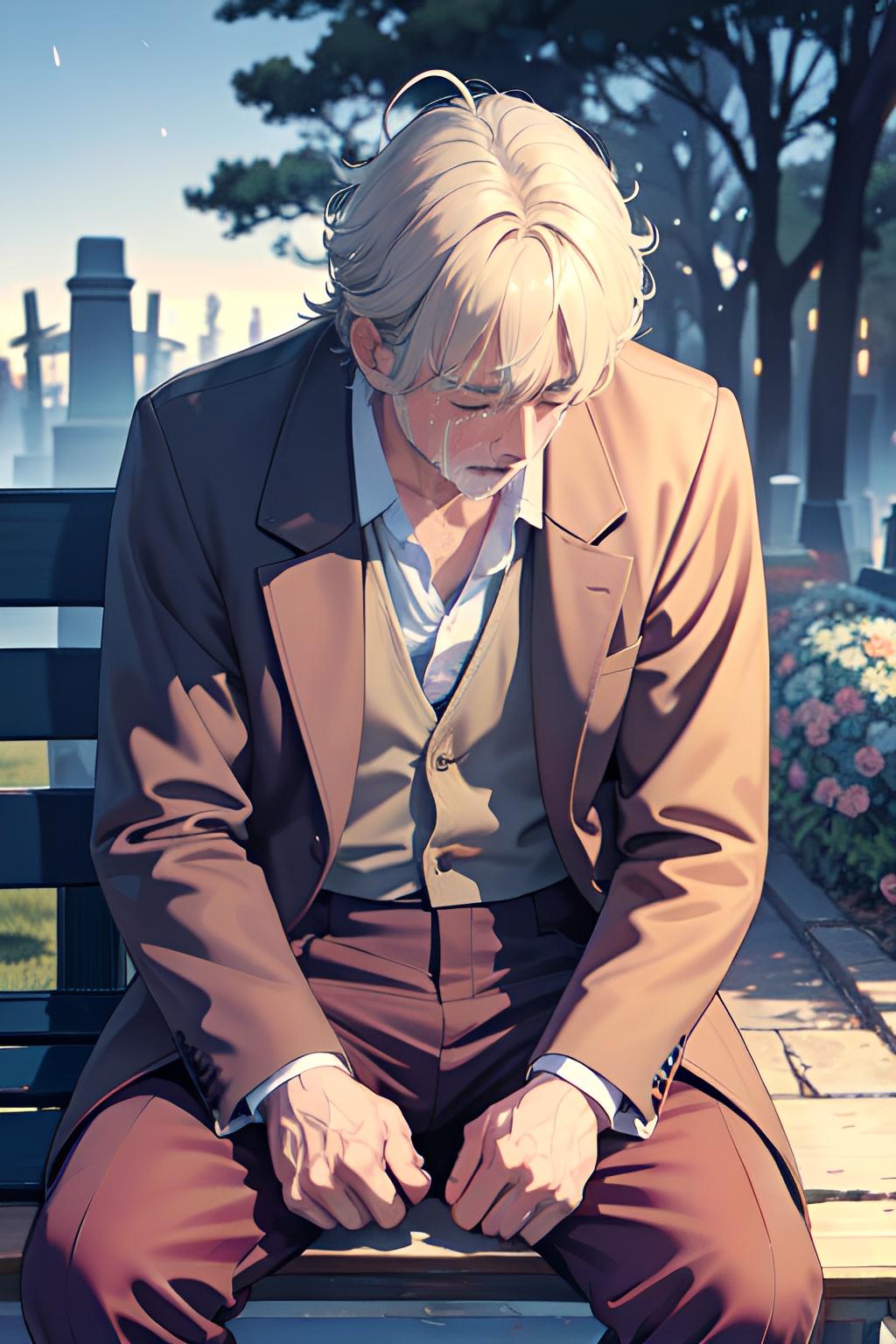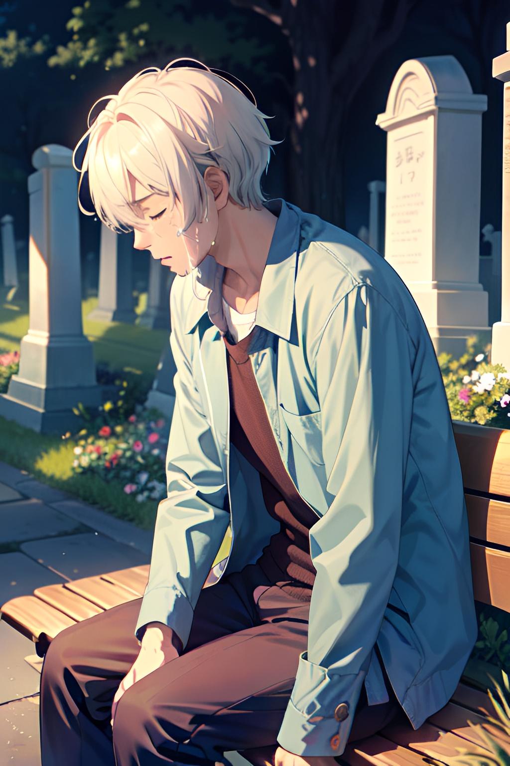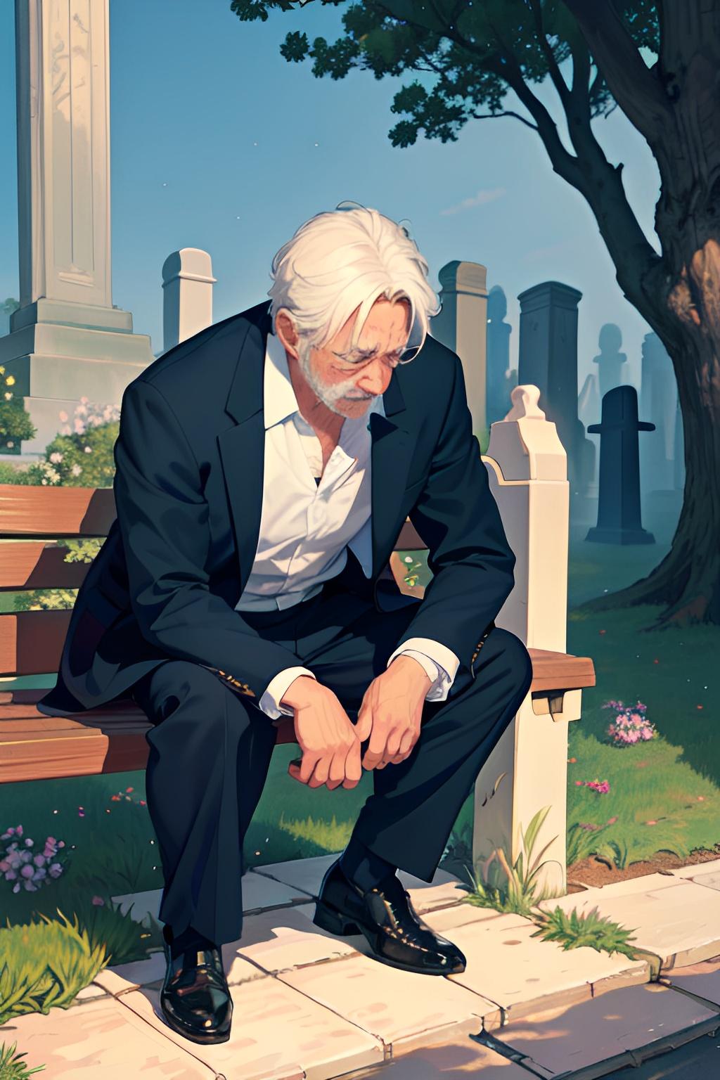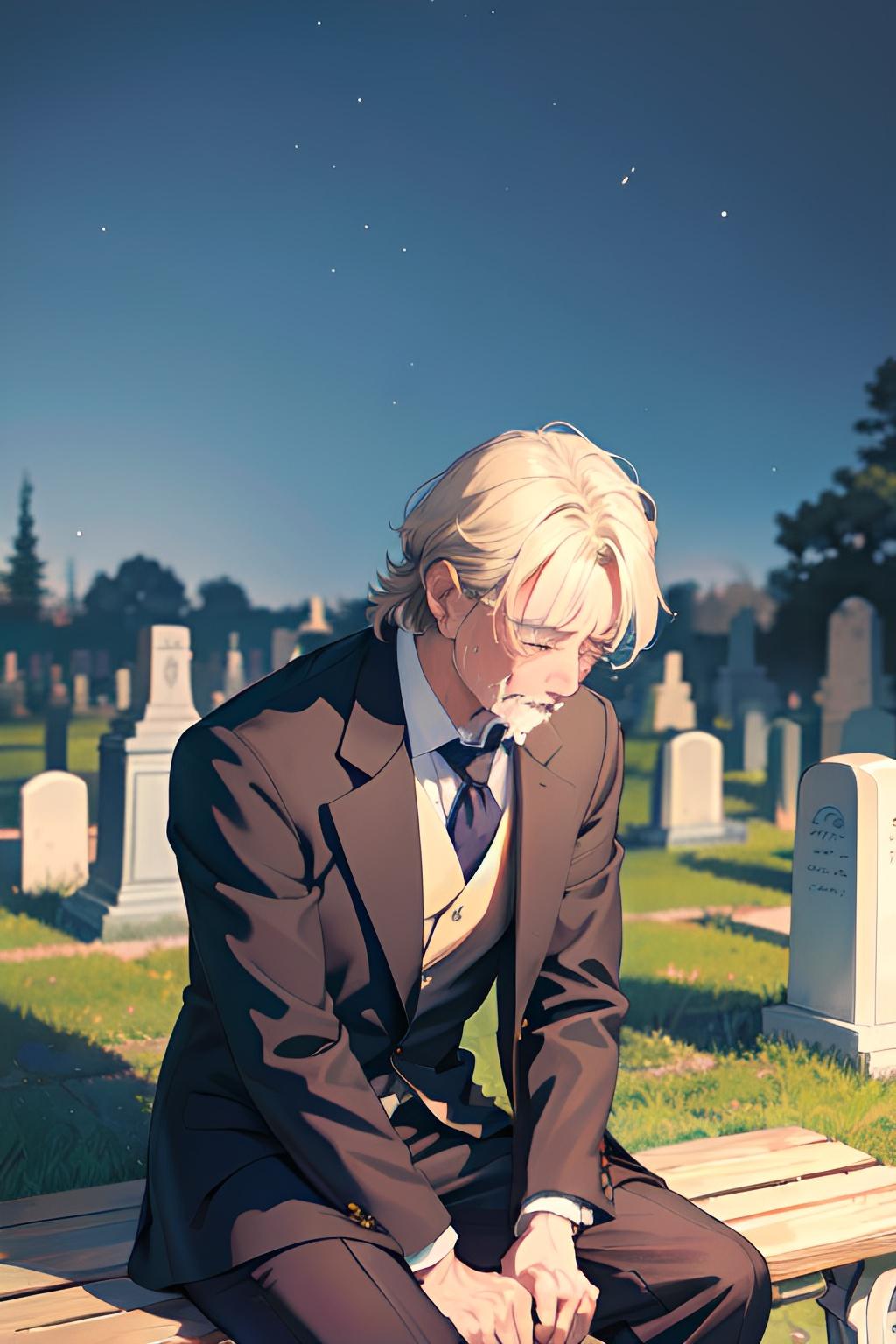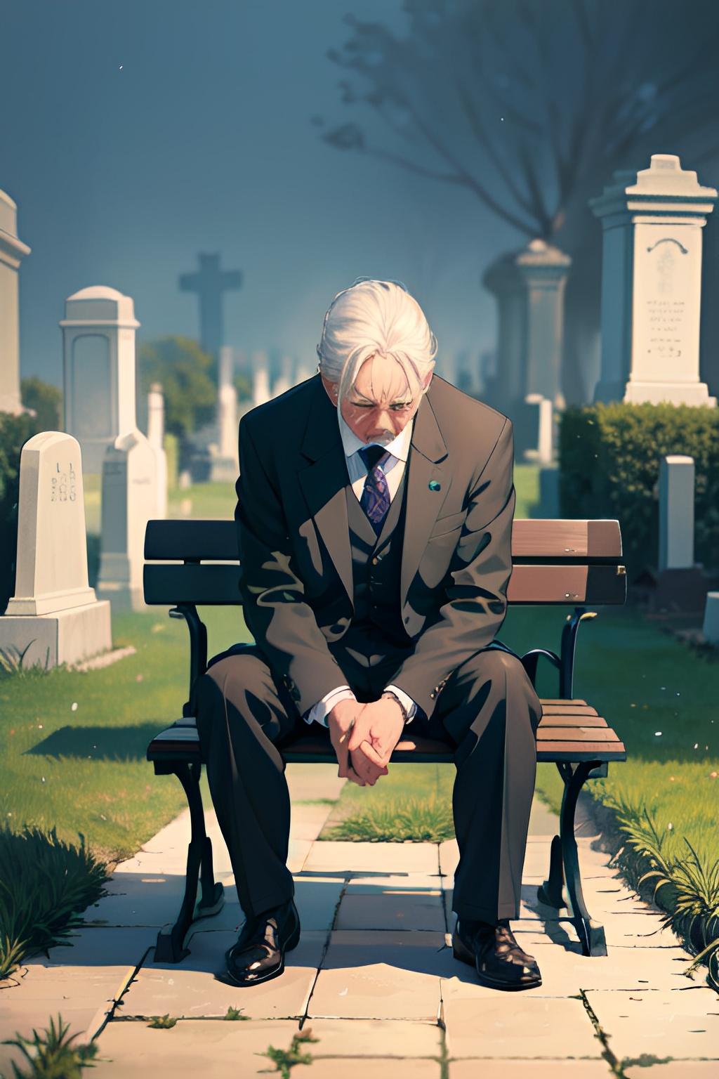 墓地のベンチで亡き妻を悼む夫