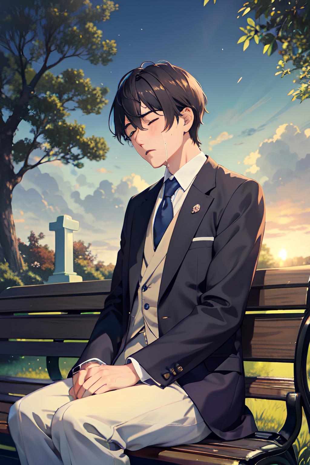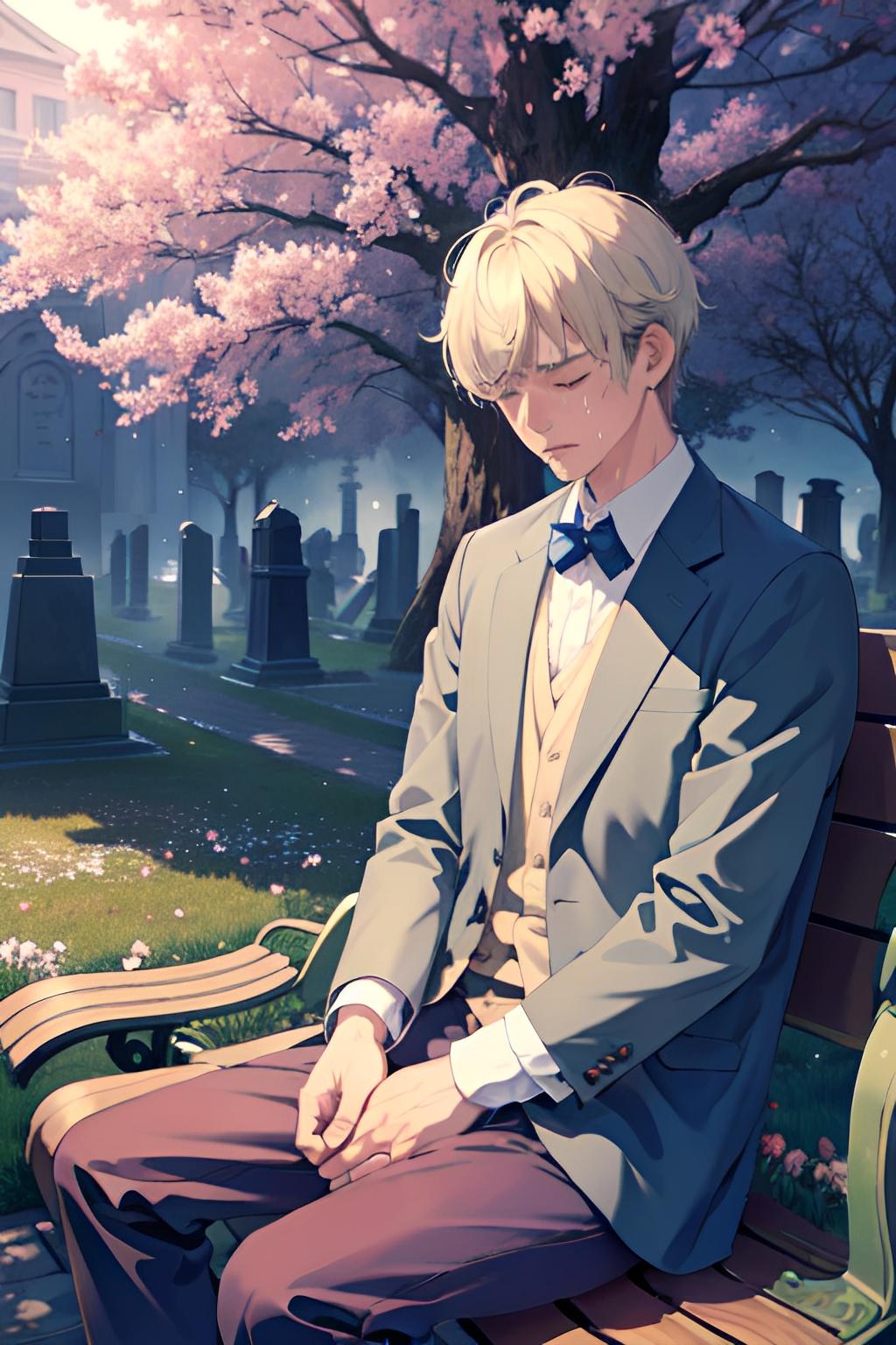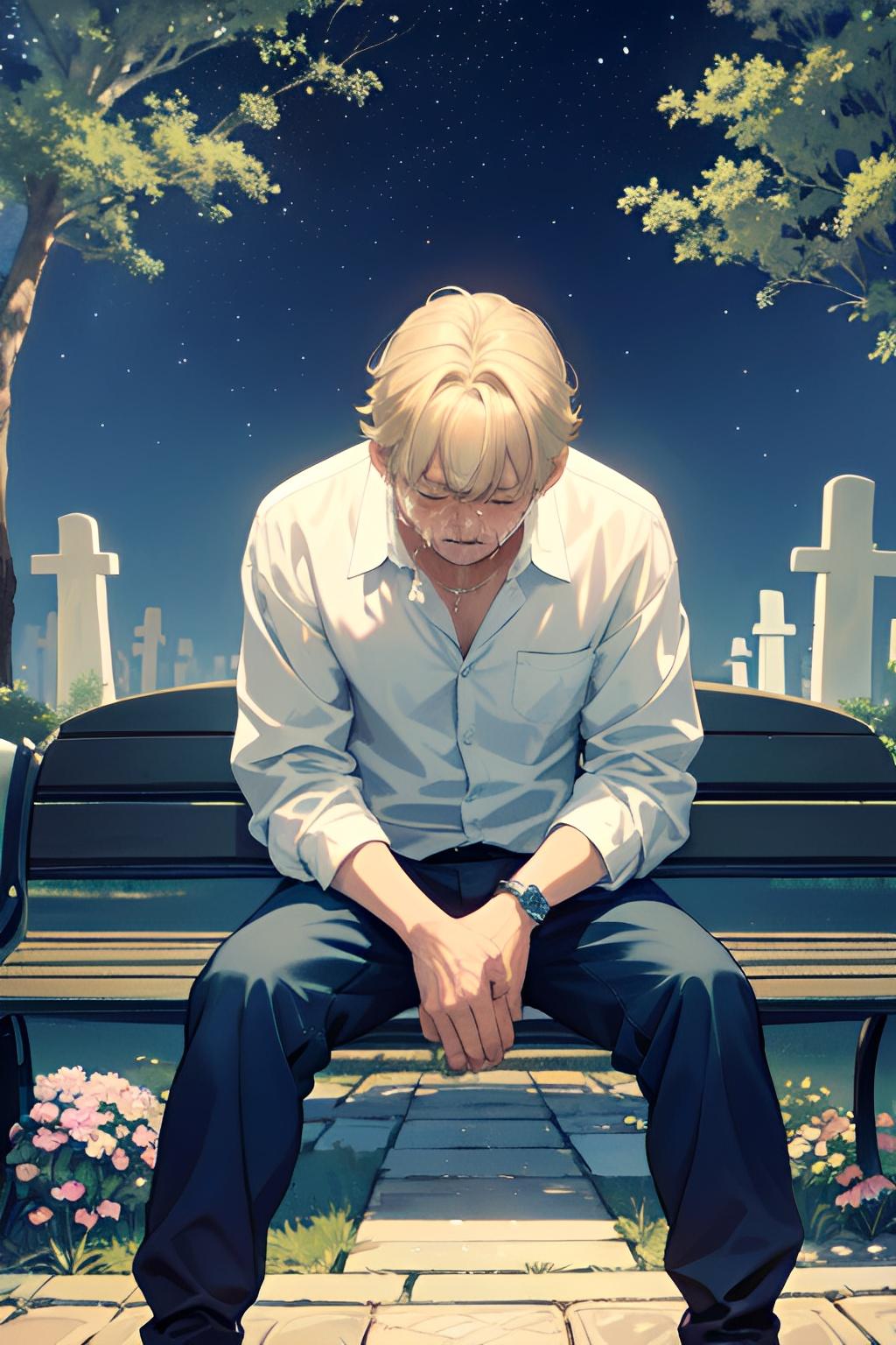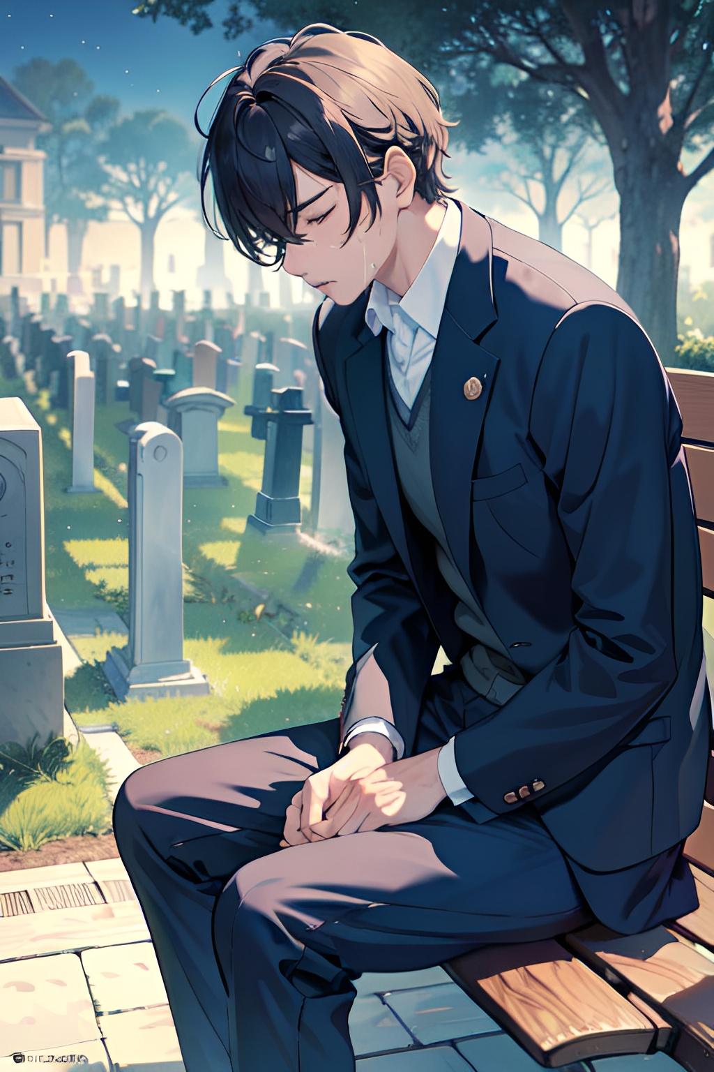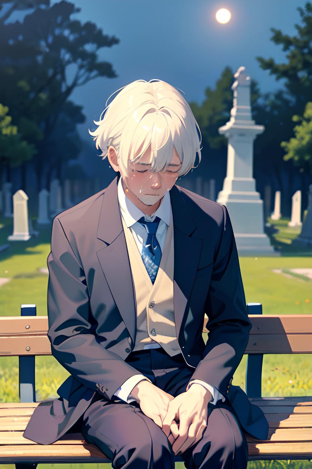 墓地のベンチで亡き妻を悼む夫