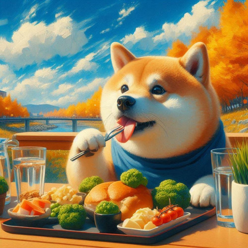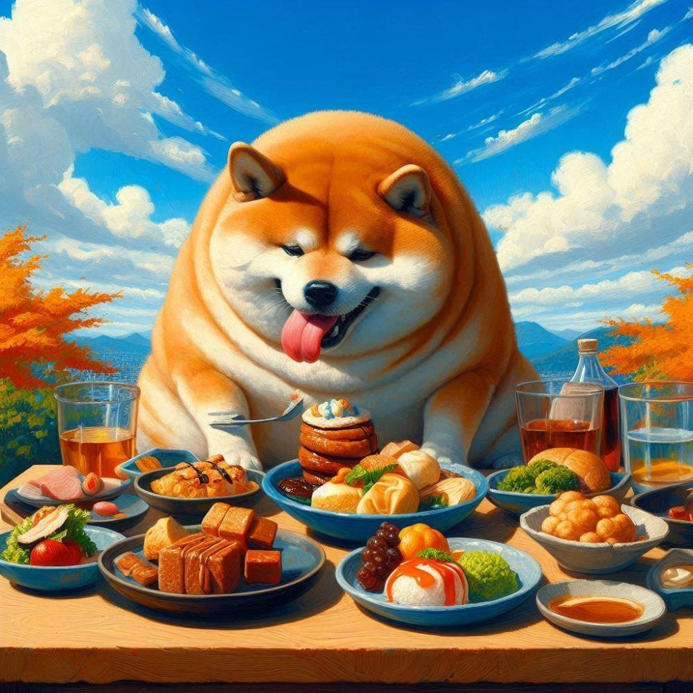 油絵、高級レストランで世界全ての美味しい料理を食べる柴犬