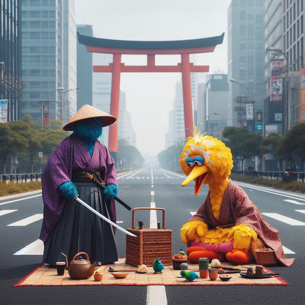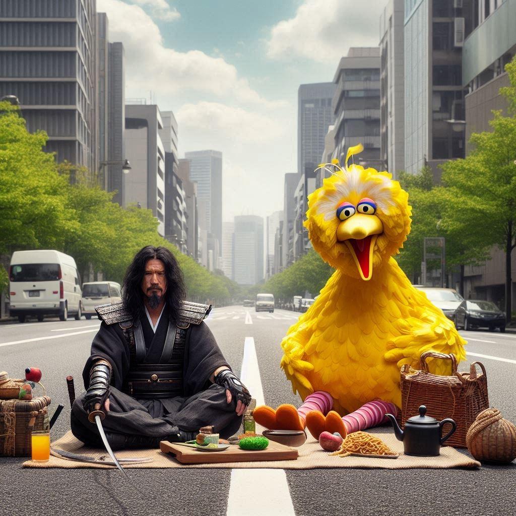 【謎画像】人の消えた街でビッグバードとピクニックをする侍