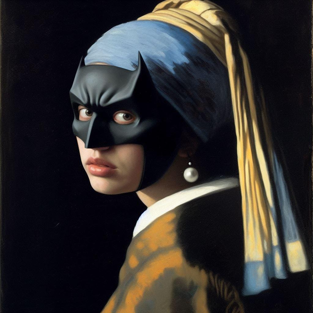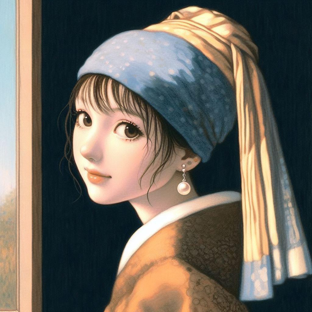 「○○のアートスタイルで、フェルメールの真珠の耳飾りの少女」という日本語プロンプトで描いてもらいました。