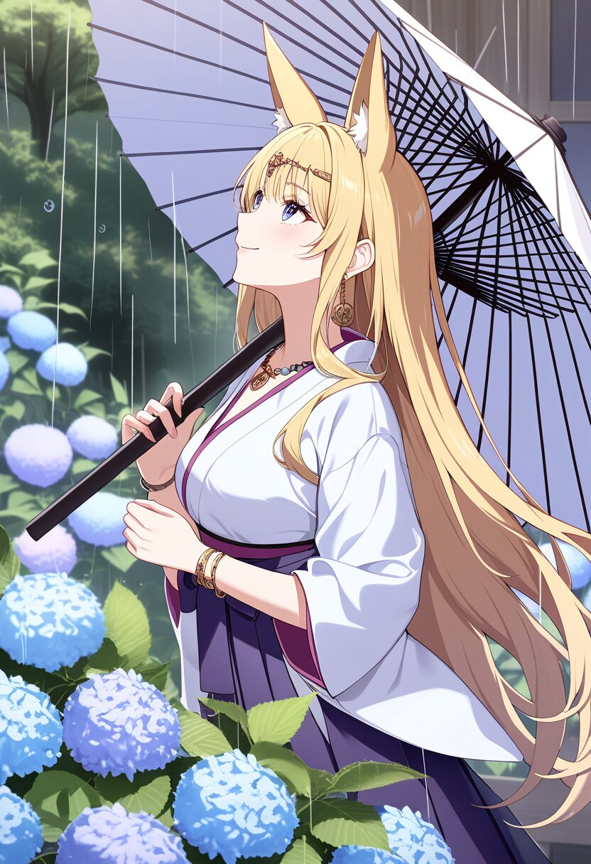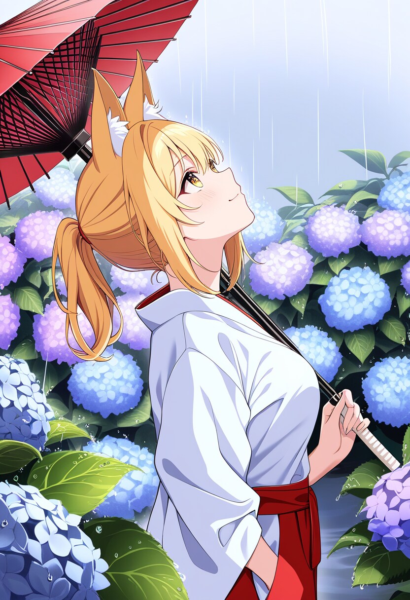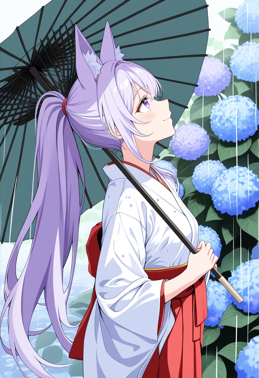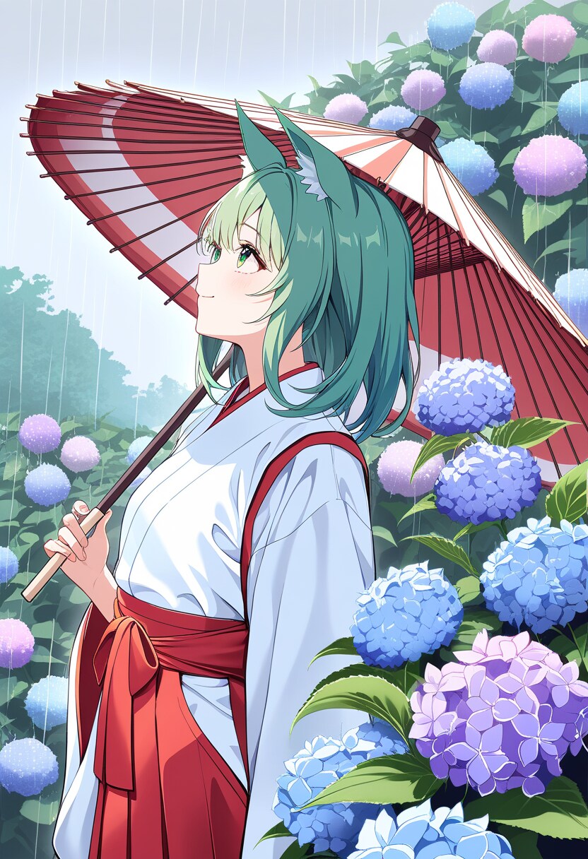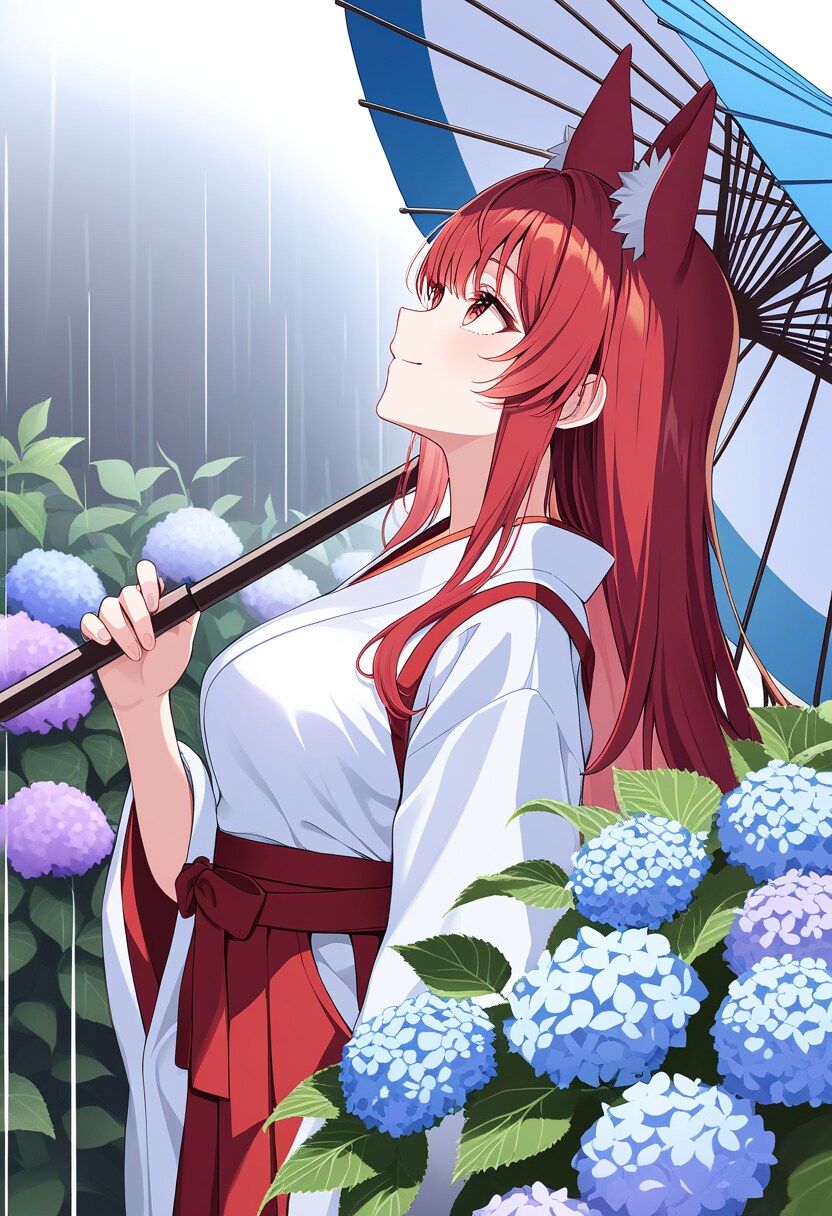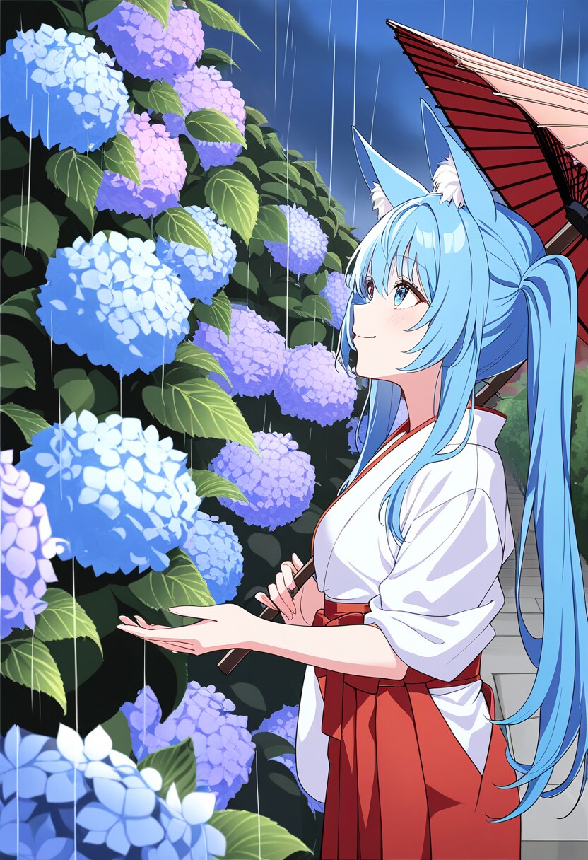 アジサイと狐巫女さん